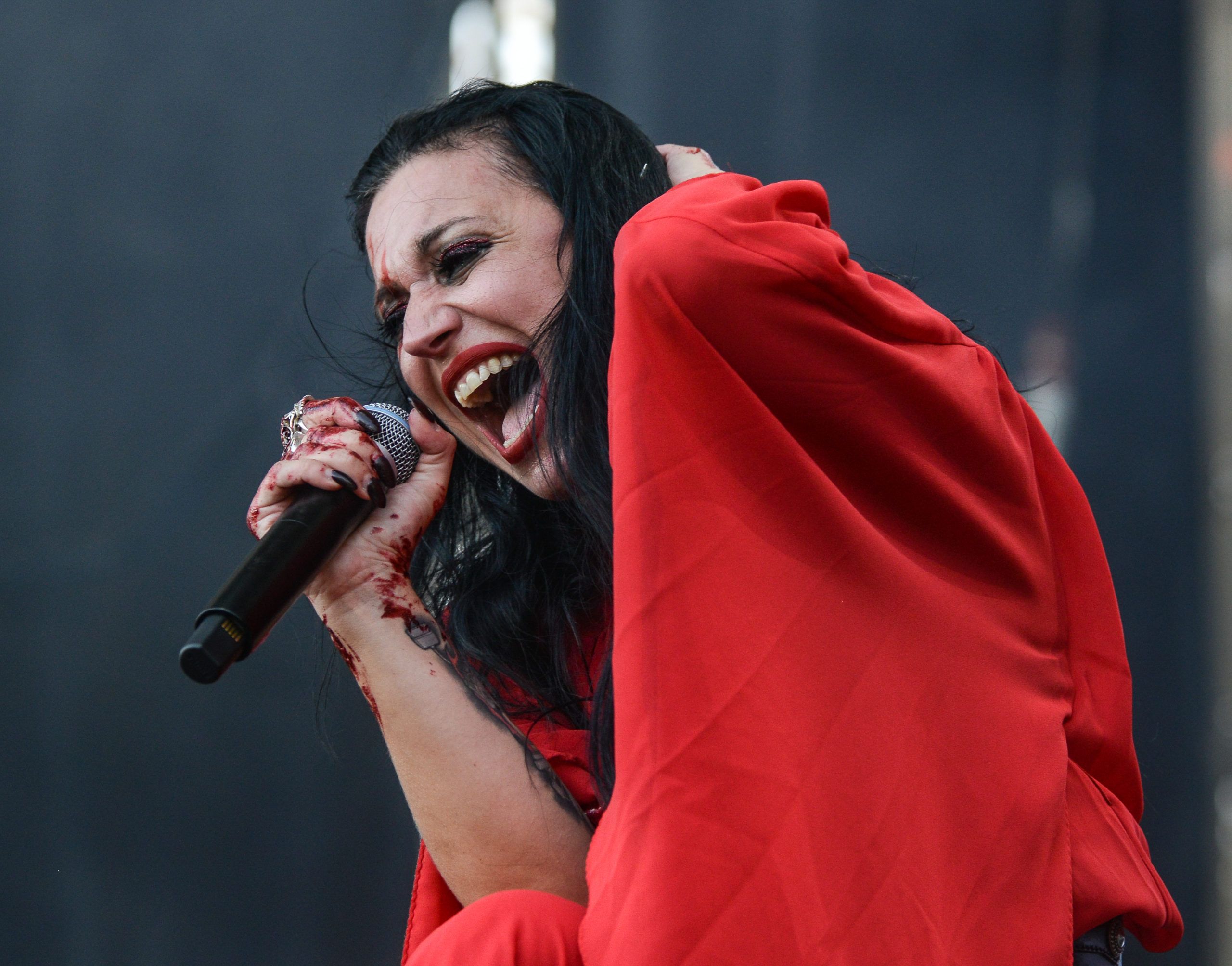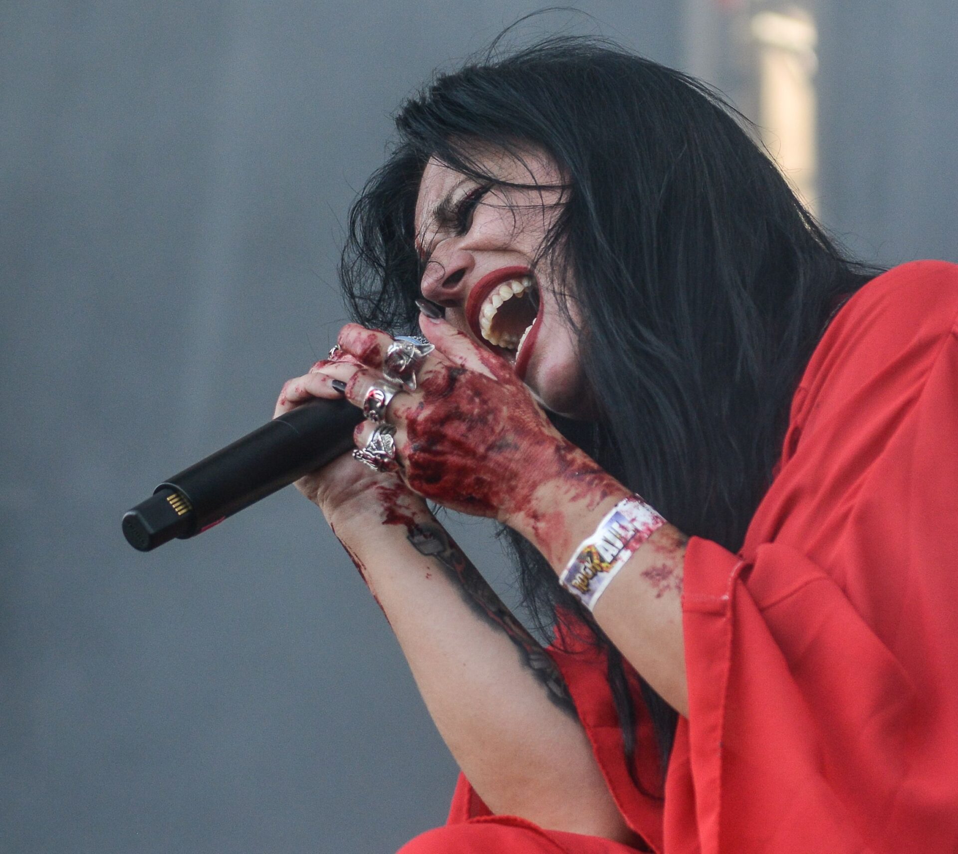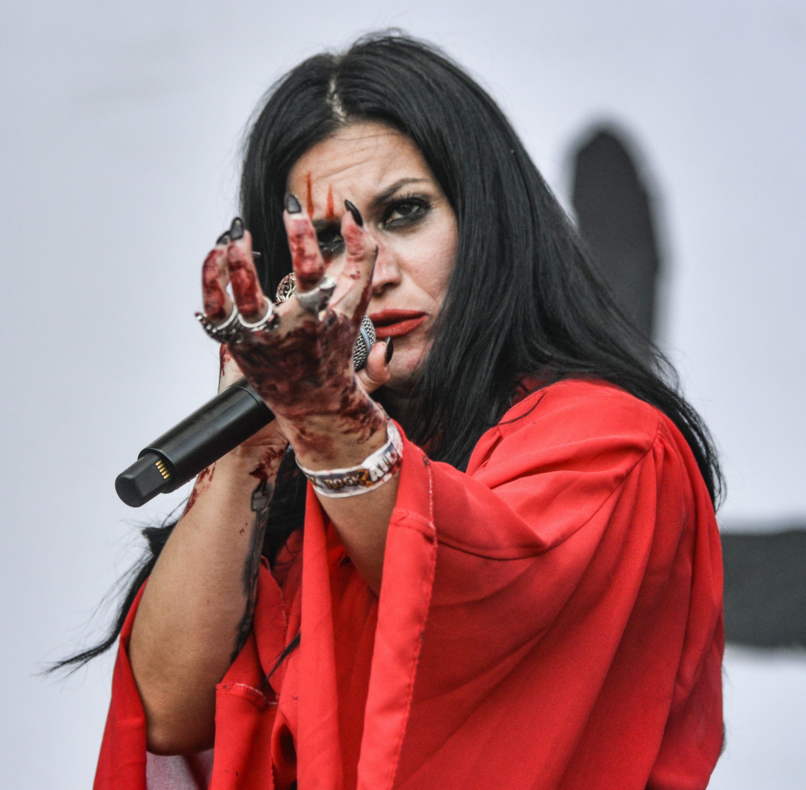The Italian band Lacuna Coil was waiting for us on the main stage next. Led by Cristina Scabbia and Andrea Ferro, they jumped to the stage with the sun still present but with a great desire to make a great show. We could see that each one was characterized in their own way. Cristina stood out with her striking beauty, wearing a red dress full of blood.