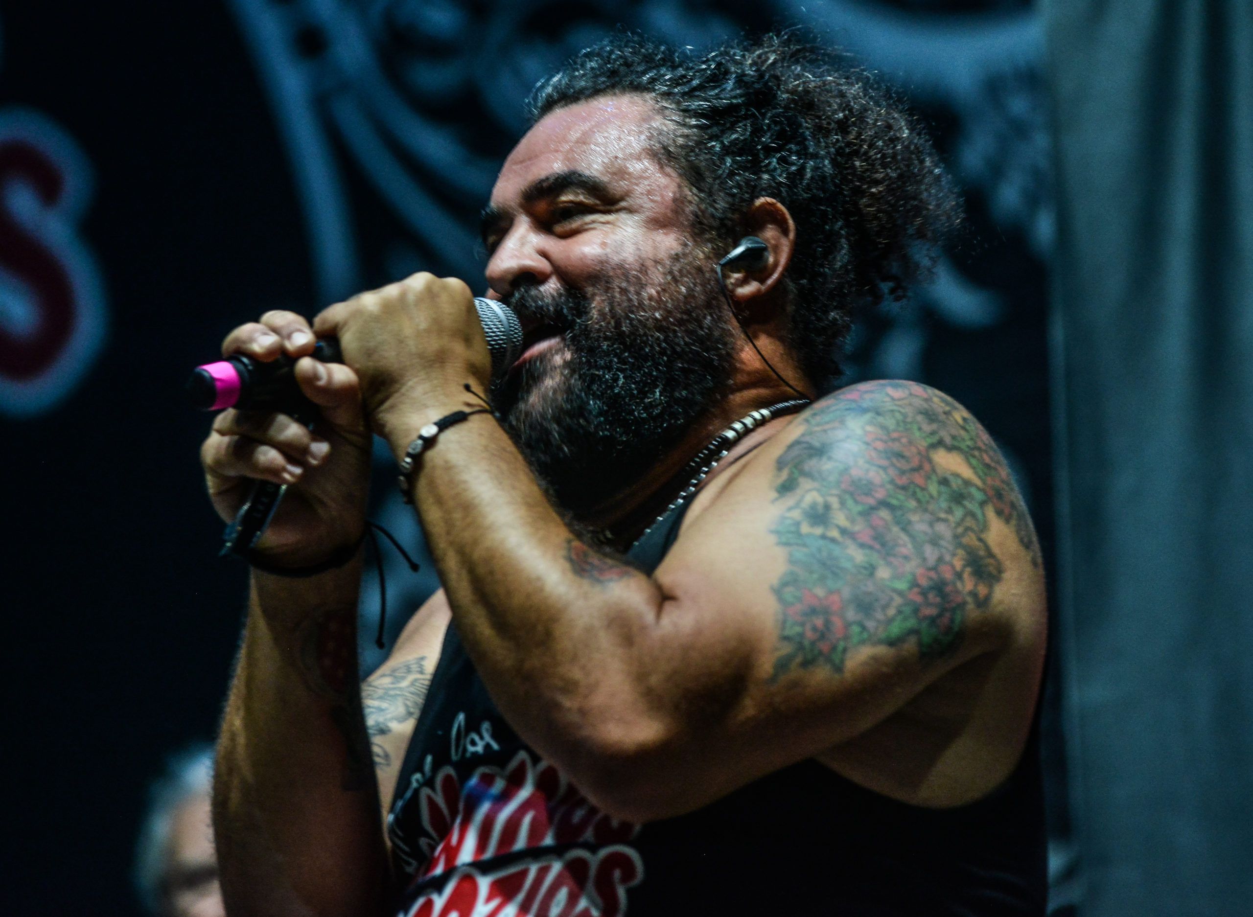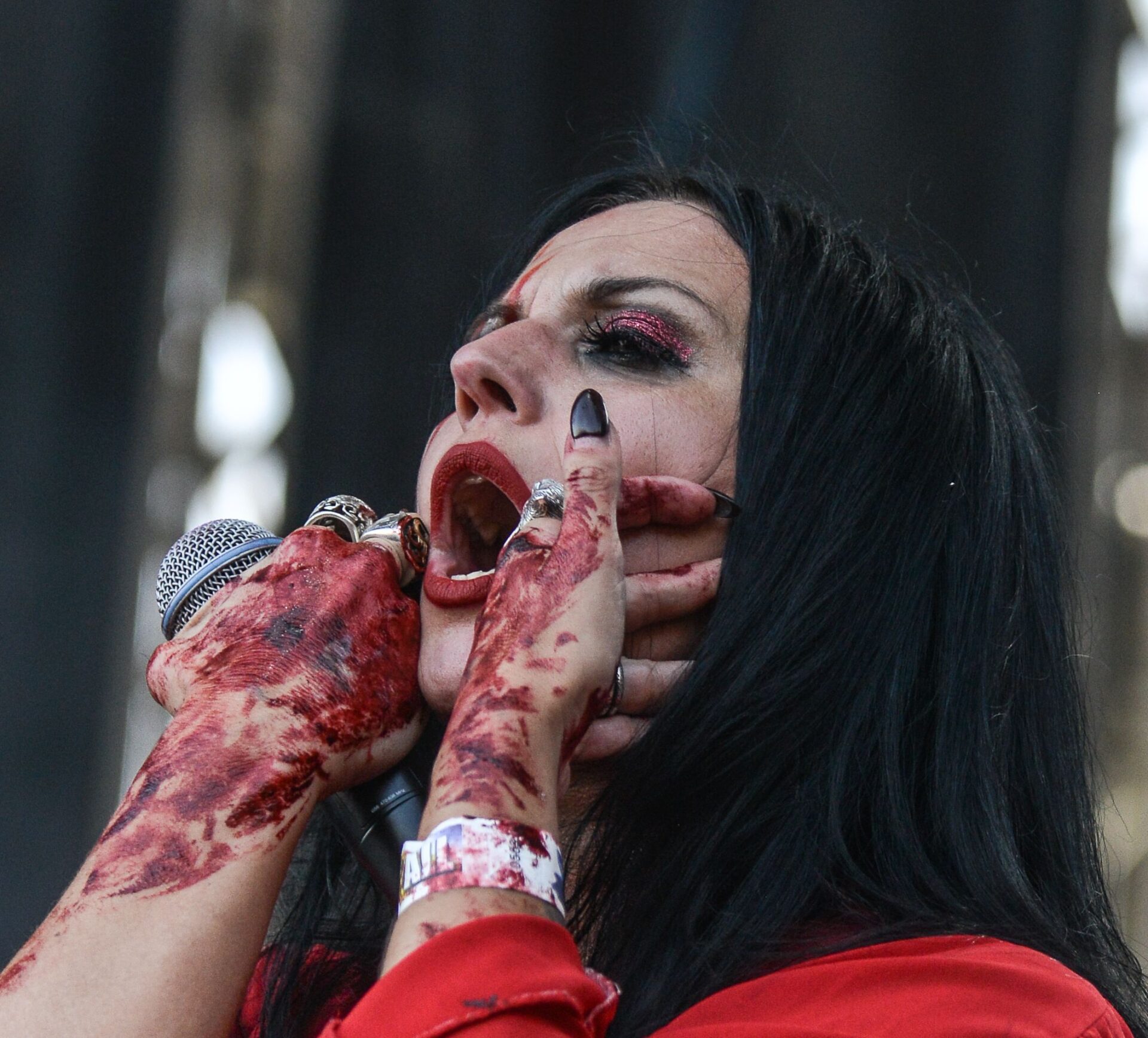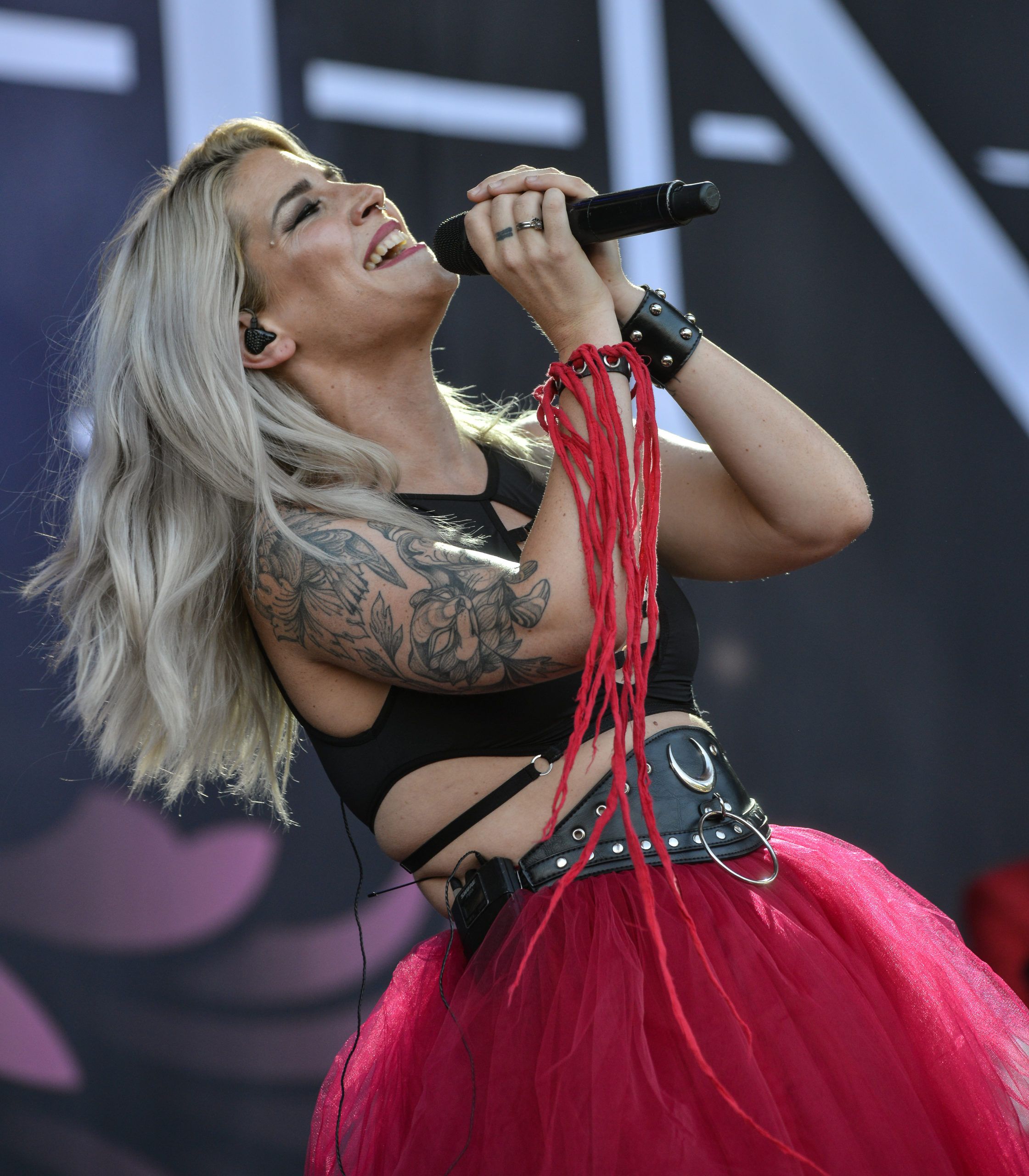 The Italian band Lacuna Coil was waiting for us on the main stage next. Led by Cristina Scabbia and Andrea Ferro, they jumped to the stage with the sun still present but with a great desire to make a great show. We could see that each one was characterized in their own way. Cristina stood out with her striking beauty, wearing a red dress full of blood.