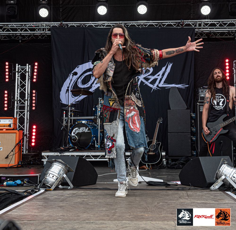 SUNDAY – Collaterol The 6 piece Kent based band fronted by Angelo Tristan delivered a full set showing masses of swagger and style. Tristan bounced and flounced on stage wearing a flamboyant full length coat he tried to remove after the first song, got his arms stuck in the sleeves and had to be helped by a crew member much to his and the crowds amusement. Releasing their debut album last year they delivered a very polished set, this band will do very well.