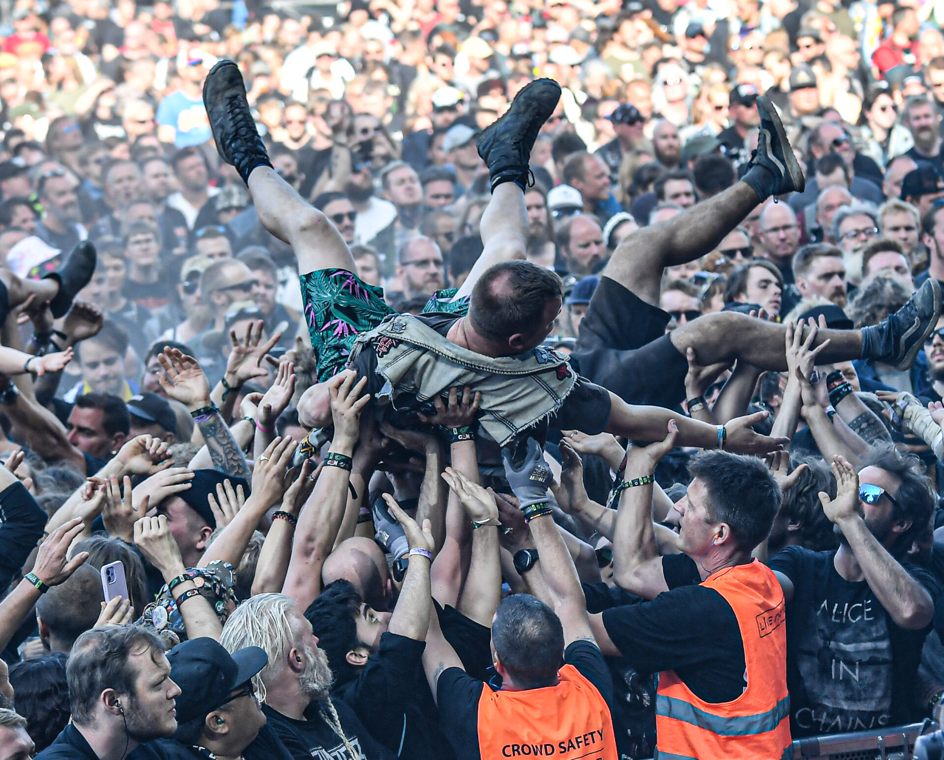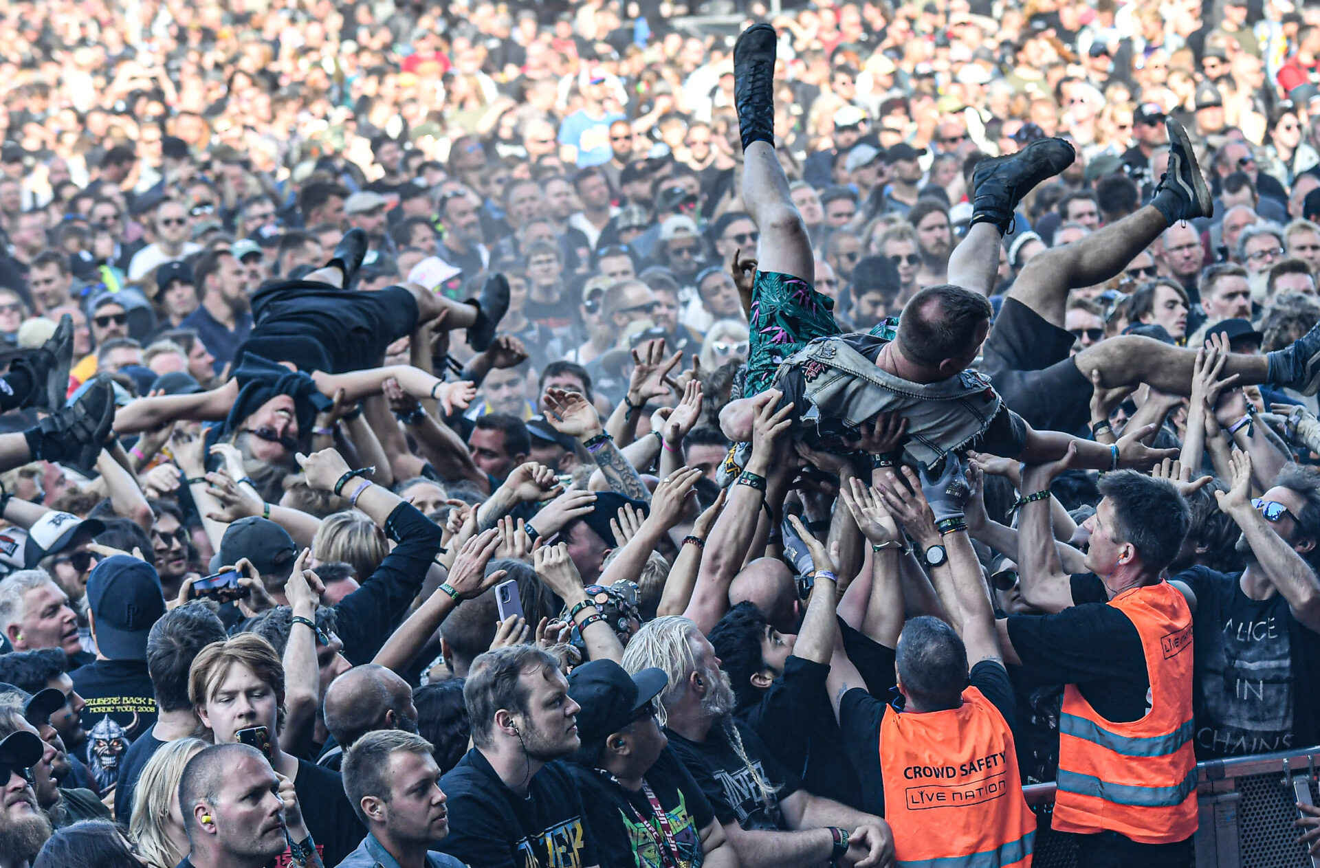 With Ghost Iris playing a hard set from several genres of music, keeping the crowd going.    After a brief intermission in which Adrian and I stretched our legs around the festival site and took some time to chill, we returned to the main stage had been taken hostage by the party pirates themselves, as Alestorm took to the stage. Now those who have been privy to Alestorms recent festival activities may have noticed their attempts to best their previous record for the number of crowd surfers by offering up the challenge to the audience. Copenhell was certainly no exception to this, and it seems only fitting that a literal wave of crowd surfers passed over a sea of people in order to aid the party pirates of metal in achieving a brand new record. The band themselves assisted their Copenhell surfers by performing a brilliant set that was both humorous and heavy. There certainly ain’t no party like an Alestorm party, and their set will certainly go down as one of the highlights of Copenhell 2022.