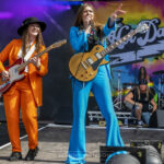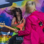A splash of colour blinds the eyes as the sensational THE HOT DAMN hit the stage. Resplendent in Pink, Orange, Green and Blue ‘suits’ the girls dance down the runway, Gill carrying a large collection of balloons. The party is in the house. Their catchy set starts off with ‘Catch me if you Can’. The band are formed from the ashes of Tequila Mockingbyrd and the Amorettes, With Josie on drums and Gill on guitar and vocals, they then enlisted hat wearing guitar wizardess, Laurie Buchanan of Aaron Buchanan & the Cult Classics and Lzi Hayes previously of ‘Lannon’ who brings a crunching bass that has helped drive the band to new levels, replacing the departed Jacinta Jaye. The set is full of laughter as the girls deliver the play a mix of old and new including the Amorettes ‘Going Down’, Planet Rock favourite ‘Dance Around’ before signing off with the single ‘I Didn’t Love You Anyway.’ With colours flashing across the set and a fabulous Tie-Dyed back drop, it would be remiss of me not to mention Josie’s stunning rainbow wrapped Natal kit, to pretty to hit hard, but she does anyways, the whirlwind is a beast once sat behind her kit of choice.