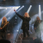 As night draws in the stage is made ready for the mighty SAXON. Having seen them at the beginning of the year on their 40th Anniversary Tour, this is a band I’ve been wanting to see again. I’m getting another fix later in the year when they embark on the ‘Seize the Day World Tour.’ Biff and the boys took this slot when American guitarist Ace Frehley pulled his European tour just weeks before the event. Hitting the stage, we start as we mean to go with ‘Motorcycle Man’ complete with its ear-piercing whistles, ‘Thunderbolt’ and the mighty ‘Wheels of Steel’ before which a battle jacket is thrown to Biff who postulates with it before putting it on. Ironically on the back is a large KISS patch. Rumour has it that Biff signed the jacket before handing it back. The band is surrounded by smoke bolting through ‘Heavy Metal Thunder’ from ‘Strong Arm of the Law‘ continues the driving rock, Glockler’s feet are working overtime as he punishes his kit. Quinn and Scarrett share the guitar duties as Nibbs Carter has his thunderbird bass rattles out a torturous deep rumble, locked in tight with Glockler crushing beat. Biff’s voice is solid as he powers through the set, at 71 he does’nt think anything of it, as he hits the note. ‘Strong Arm Of The Law’ is up next, the crowd ever eager to sing joining in the chorus of this rousing tune. ‘They Played Rock and Roll’ from the album ‘Thunderbolt’ is up next. This tribute to Motörhead is full of their trade mark drum beat, fast guitar and thundering bass lines this powerful delivery isn’t faltering as the band lock in tight and deliver this crushing anthem. Six songs in and three albums visited, ‘Solid Ball Of Rock’ makes it four, that being from 1995’s ‘Dogs of War.’ ‘Solid Ball Of Rock’ follows from the self-titled album. The chugging intro leads into a solid snare beat. The twin guitars are locked in as Biff sings about being in Louisiana on Highway 84, a driving tune that takes us into the classic ‘Denim and Leather’ from the self-titled album from 1981. And then into the crushing pile driver of a song ‘Battering Ram’ again from the 2015 self-titled album. Scarrett leads the way with a scorching guitar, Glockler works over time as he thunders out a steady kick drum, Biff is walking and pointing as he sings ‘Battering Ram.’ Nibbs is as ever bounding around the stage pointing at individuals in the crowd as he does so. ‘The Eagle Has Landed’ wins the vote by the crowd. Another album, 1983’s ‘Power And The Glory‘ is featured. With it’s slow almost ballad style start has the crowd cheering, the horns are flying as Guitars cry out in time to Glocklers rock steady beat.
