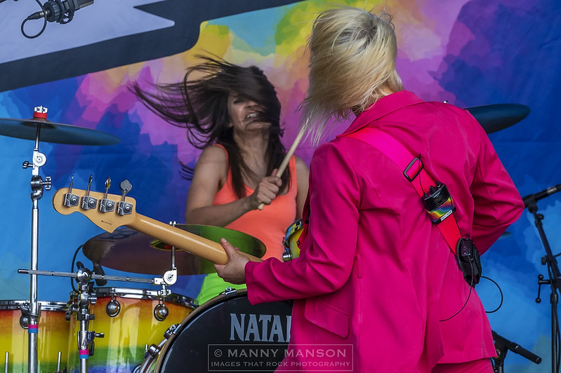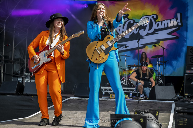 A splash of colour blinds the eyes as the sensational THE HOT DAMN hit the stage. Resplendent in Pink, Orange, Green and Blue ‘suits’ the girls dance down the runway, Gill carrying a large collection of balloons. The party is in the house. Their catchy set starts off with ‘Catch me if you Can’. The band are formed from the ashes of Tequila Mockingbyrd and the Amorettes, With Josie on drums and Gill on guitar and vocals, they then enlisted hat wearing guitar wizardess, Laurie Buchanan of Aaron Buchanan & the Cult Classics and Lzi Hayes previously of ‘Lannon’ who brings a crunching bass that has helped drive the band to new levels, replacing the departed Jacinta Jaye. The set is full of laughter as the girls deliver the play a mix of old and new including the Amorettes ‘Going Down’, Planet Rock favourite ‘Dance Around’ before signing off with the single ‘I Didn’t Love You Anyway.’ With colours flashing across the set and a fabulous Tie-Dyed back drop, it would be remiss of me not to mention Josie’s stunning rainbow wrapped Natal kit, to pretty to hit hard, but she does anyways, the whirlwind is a beast once sat behind her kit of choice.