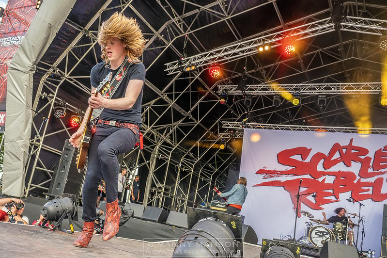 Local boys SCARLET REBELS take to the stage next. Dwarfed by the huge ‘REBELS’ backdrop are keen to get going, there’s a good quarter of an hour to catch up on with Kira’s delay. Kicking off with ‘I’m Alive’ the scorching guitars of Jones and Doyle rip in as we get under way. A kit issue has the crowd singing to the band as the offending item is replaced. ‘Save Me,’ ‘See Through the Blue’ and ‘These Days’ follow, the latter featuring a ‘Fuck the Tories’ quote which brings huge cheers from the crowd. The band are a tight unit and have a huge following non so evident as today as Doyle takes to the mic and finishes the set with ‘Heal’ a classic rock track full of emotion. The local boys have done good and laid the gauntlet down for the next band.