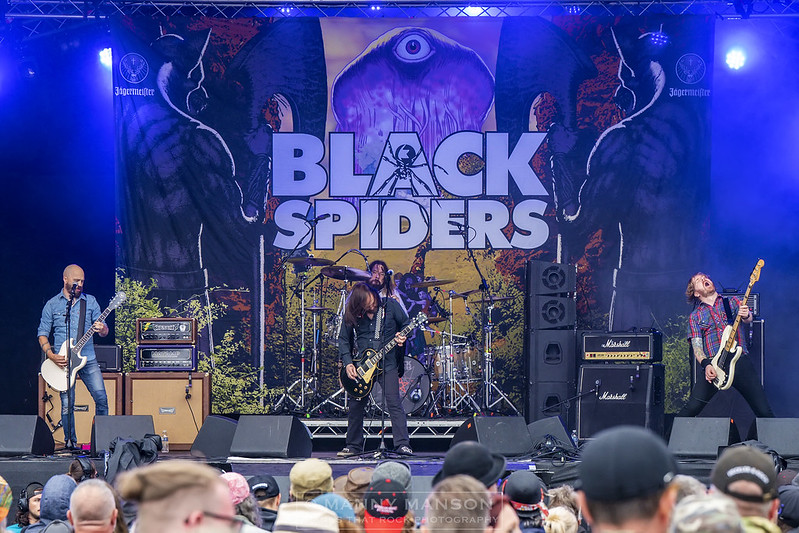 One of Planet Rocks Premiere DJ’s now takes to the stage, throwing drumsticks in to the crowd on the way to his kit. Wyatt Wendell’s has brought his ‘Cymbals of Appreciation’ up the Steelhouse Mountain in the form of his manic band BLACK SPIDERS. This crushing powerhouse mash up of all things gargantuan sounding deliver a 45minute set full of rip snorting abuse. From the powerhouse opening track, ‘Death Comes Creeping’ to the set closer ‘Kiss Tried To Kill Me’ the band deliver a trail of destruction. ‘Spider’ Spilby on vocals, stands front and centre, his gritty voice keeps the ship err ship shape as he lets loose on this high-octane set. The Guitar of Denim wearing ‘Owl’ Lister has the finesse of a police bartering ram as he delivers scorching licks in ‘Stick It to The Man,’ full of string bends and distorted madness to the cacophony of ‘Stabbed in The Back.’ Wendell’s, preening in-between barrages of shear chaos around the kit looks content as he tears into 60’s smasher ‘Good Times’ and locking in tight with ‘Fox’ Irwin create a psychotic barrage of rhythmical abuse that is ‘Teenage Knife Gang’ finishing the set with ‘Kiss Tried To Kill Me’ from 2011’s Sons Of The North, with its ‘Merican riffing sound bringing the set to an untimely end. Black Spiders maybe not be to everyone’s liking, but give them a go, they converted me, a cracking set.