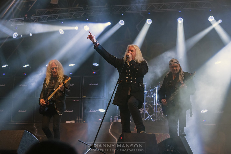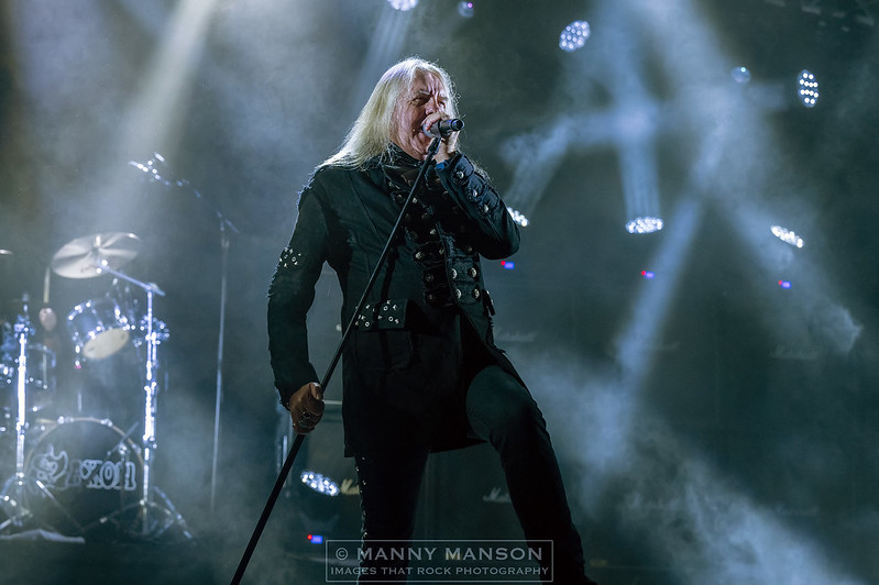 As night draws in the stage is made ready for the mighty SAXON. Having seen them at the beginning of the year on their 40th Anniversary Tour, this is a band I’ve been wanting to see again. I’m getting another fix later in the year when they embark on the ‘Seize the Day World Tour.’ Biff and the boys took this slot when American guitarist Ace Frehley pulled his European tour just weeks before the event. Hitting the stage, we start as we mean to go with ‘Motorcycle Man’ complete with its ear-piercing whistles, ‘Thunderbolt’ and the mighty ‘Wheels of Steel’ before which a battle jacket is thrown to Biff who postulates with it before putting it on. Ironically on the back is a large KISS patch. Rumour has it that Biff signed the jacket before handing it back. The band is surrounded by smoke bolting through ‘Heavy Metal Thunder’ from ‘Strong Arm of the Law‘ continues the driving rock, Glockler’s feet are working overtime as he punishes his kit. Quinn and Scarrett share the guitar duties as Nibbs Carter has his thunderbird bass rattles out a torturous deep rumble, locked in tight with Glockler crushing beat. Biff’s voice is solid as he powers through the set, at 71 he does’nt think anything of it, as he hits the note. ‘Strong Arm Of The Law’ is up next, the crowd ever eager to sing joining in the chorus of this rousing tune. ‘They Played Rock and Roll’ from the album ‘Thunderbolt’ is up next. This tribute to Motörhead is full of their trade mark drum beat, fast guitar and thundering bass lines this powerful delivery isn’t faltering as the band lock in tight and deliver this crushing anthem. Six songs in and three albums visited, ‘Solid Ball Of Rock’ makes it four, that being from 1995’s ‘Dogs of War.’ ‘Solid Ball Of Rock’ follows from the self-titled album. The chugging intro leads into a solid snare beat. The twin guitars are locked in as Biff sings about being in Louisiana on Highway 84, a driving tune that takes us into the classic ‘Denim and Leather’ from the self-titled album from 1981. And then into the crushing pile driver of a song ‘Battering Ram’ again from the 2015 self-titled album. Scarrett leads the way with a scorching guitar, Glockler works over time as he thunders out a steady kick drum, Biff is walking and pointing as he sings ‘Battering Ram.’ Nibbs is as ever bounding around the stage pointing at individuals in the crowd as he does so. ‘The Eagle Has Landed’ wins the vote by the crowd. Another album, 1983’s ‘Power And The Glory‘ is featured. With it’s slow almost ballad style start has the crowd cheering, the horns are flying as Guitars cry out in time to Glocklers rock steady beat.