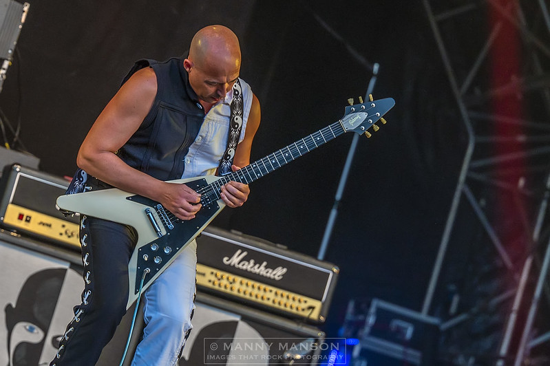 Old faithful festival touring band DIAMOND HEAD are up next. This band has been about forever, in fact Metallica site them as being a major influence on their sound. Brian Tatler and the boys waste no time in getting down to it. Opening the score with ‘Play It Loud’ from the 1980 album, Lightning to The Nations has Rasmus down the runway in the sunshine, on his haunches delivering this great opener, ‘The Messenger’ follows on as the rest of the band wind up and deliver a powerful support to Rasmus’s fine vocal. Not seeming to mind the hot sun on his head the band crack on with ‘Lightning to The Nations’, ‘In the Heart of The Night’ and ‘Belly of the Beast.’ Bass work is being handled well by auditionee, Ben Clark, looking for a moment like one of the SAS guys from the TV, he seems to have picked up the part well and is enjoying the set. “ABBZ” seems to be enjoying the event as he windmills ala Pete Townsend, through the opening songs. Karl Wilcox’s metronomic timing on ‘Sweet and Innocent’, allows Tatler to lay a rocking riff, Rasmus’s sweet vocal soars all over it as the harmony’s make way for a rattling run around the kit, leading back into a rousing guitar riff that drives the song along at a gallop. ‘Set My Soul on Fire,’ a darker, broodier song follows on with Tatler smiling as he delivers a filthy riff. Rasmus is, foot on wedge slowly delivering this great tune lyric, from 2016’s ‘Diamond Head’ album. As this anthemic belter finishes with a screaming guitar solo, were told theirs’s only a couple more to go, the crowd are shouting out for ‘Am I Evil’ but we’re made to wait for that as we get ‘Shades of Black’ first with its striking drum intro and dual guitars.