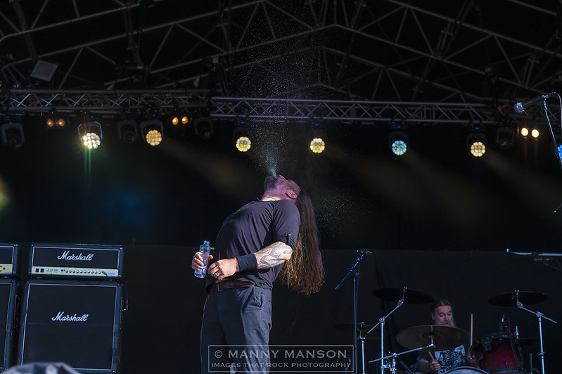 As the day slowly brightens, right on cue. MOTHER VULTURE takes to the stage. This band need to carry a health warning as from the opening note they’re a whirling dervish of a band. Bassist Chris Simpson looks disappointed as he can’t get to the end of the runway due to his lead being too short, he watches on as his partner, gymnast in crime Brodie Maguire throws out a floor routine worthy of any gymnast, to make matters more interesting he leaps not once but twice from the stage into the crowd, the second time leaping over the head of singer Georgi Valentine. He then went on to writhe on the ground with his beautiful metallic green Gretsch guitar, how either didn’t break their neck is amazing. The set finishing with Valentine and Maguire sat at the runway end whilst drummer Matt West and Bass player Chris Simpson sat with their legs dangling over the main stage. Their Punk fringed brand of metal worked well with their frenetic acrobatics, what an opening set leaving many a mouth wide open, mine included. I feel a bit sorry for ANCHOR LANE who now have to follow such a nuclear band.
