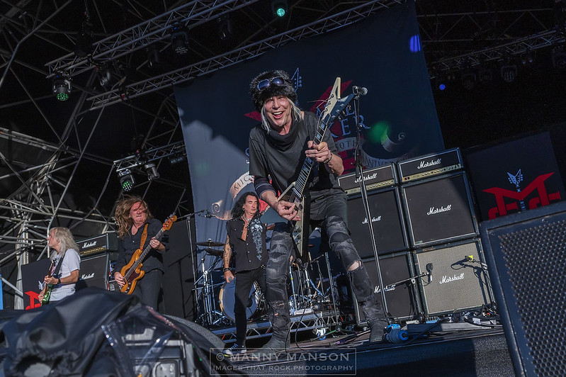 The mighty MICHAEL SCHENKER needs no introduction. This smiling guitar god has been there and done it. As a youth he helped the Scorpions gain world recognition, his turbulent times with those in UFO are well documented, the MSG years and subsequent spin offs have all left us with a stunning back catalogue to choose from. For this set we have the amazing Robin McAuley on vocals, a powerhouse of a voice and a great choice. They open proceedings with ‘Into the Arena’ a stunning track from 1980’s album ‘The Michael Schenker Group’. The romping riffs of Schenker locked in with the drums of Bodo Schopf and the bass of Barend Courbois thunder across the arena, the tinkling of the keys from Steve Mann completing the sound as, now the band are warmed up in the early evening sun, ‘Cry for the Nations’, from the same album screams from Schenker’s fingers. The powerful voice of McAuley resonates as he ambles down the runway amidst the crowd. Schenker’s nimble fingers shred out the awesome solo of this early track. This flows into the opening of one of Schenker, and his then band, U.F.O.’s, first and biggest hit. ‘Doctor Doctor’, from Phenomenon released in 1974, yes 1974, that’s how long this bouncy track has had fans singing along too it. A staple of and Schenker gig and played early as there will no doubt be a U.F.O. medley later on. The band bounce as Schenk’s delivers. A stunningly timeless track.‘Looking for Love’ from the second ‘MSG’ album, from 1981 follows then ‘Red Sky’ from ‘83’s ‘Built to Destroy’ and ‘Sail the Darkness’ from the newer album ‘Immortal’ which gets a rousing cheer. Its full of dark 80’s riffs that take you back to yesteryear despite being released in 2021. Another U.F.O. tune gets the crowd bouncing again. ‘Lights Out’ from 1977’s lights out album, a bit of trivia but this was the first album to feature keyboard and rhythm guitarist, Paul Raymond who had joined the band in 1976. Some would say it was U.F.O.’s crowning glory as it included ‘too hot to handle’ ‘lights out’ and symphonic epic ‘love to love.’ A visit back to the first album brings us the banger that is ‘Armed and Dangerous.’ The album being his first after leaving U.F.O. the anthemic vibe is still hard hitting as the horns and fists are flying as the band belt out this riffing masterpiece. McAuley’s voice is as powerful and youthful as remembered from the days of yore. Schenker’s Dean Flying V is being pointed as, hat wear he smiles at the crowd as the riffs fly. The leather jacket is long gone as he now favours a baggy cowl necked black tee shirt over his ripped jeans. Universal, the latest album has ‘The King Has Gone’ played next. Full of Blackmore-esque riffs and the repeated references to the legacy left by probably the world’s greatest ever rock singer, non-other than the late Ronnie James Dio. The repeated Rainbow and Black Sabbath song references leave you in no doubt that the band hold Ronnie in the highest of esteems. The solo is pure Schenker, dripping with melody, my track of the set, as we sing ‘Watching Our Rainbows Rising.’ The second half of the set is dedicated to Schenker’s U.F.O. days, starting with ‘Rock Bottom.’ It’s a great intro has the crowds bouncing like Tigger on a sugar rush. Those who know are singing along, myself included, this is vintage Schenker, stunning, as he solos for an eternity just like the 1978 live album ‘Strangers in the Night‘. Schenker demonstrates his technique and speed, Mann on keys gives it a racy effect on this epic number. One of my favourite tracks ‘Stop Stop’ follows. This one is from ‘Force It’ the 1975 release. McAuley’s voice is stunning on this, far better suited to it than Mogg’s, in both tune and range as Schenker lets fly with yet another tasty lick or two, crouching over his vee, locked in the crook of his right knee.