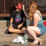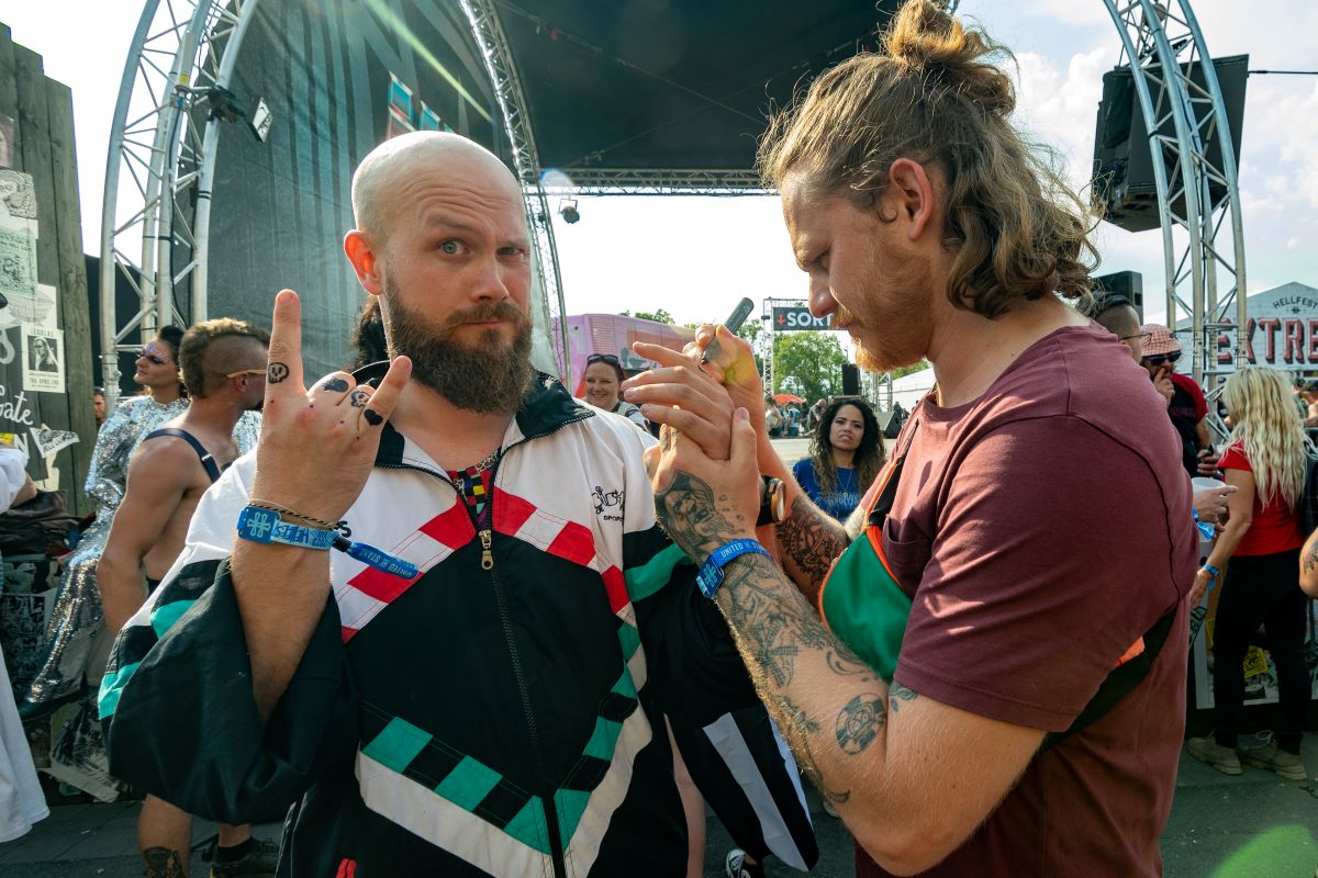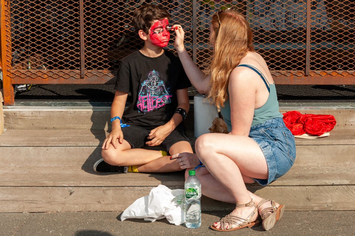 A visual spectacular of hair colours and style, tattoos and piercings as old friends, new friends and lovers, share tales of past Hellfest seasons and plan what bands they will see, that no one can seem to agree on. Gigi and Bernie from France via Google Translate, tell me its taken them 10 years to get tickets – it’s their first Hellfest as it is mine. Camil wearing a merchandise singlet from the Swedish melodic death metal band Dark Tranquillity, tells me shes a Veterinary Surgeon from Columbia and proudly shows me her half sleeve of abstract ink on her arm of her first veterinary surgery completed– a ‘C’ section on a cat to save one of four kittens. For Camil she says, “Metal is life. It is my way of life.” It seems to be the way of all heading for this event. Access roads leading to the gates of Hell gradually begin to overflow until a human gridlock occurs as Hellfestians under a hot and blazing sun struggle with backpacks and all sorts of camping gear as they hustle for positions close to the entry gates.