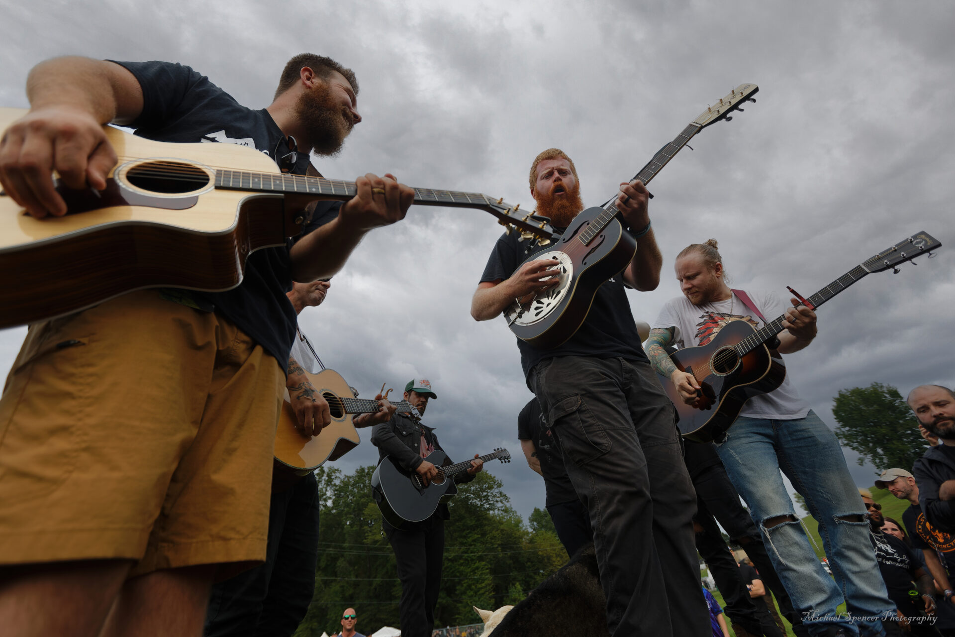 between the performers and the crowd but a low guardrail and there are band members from a few bands there with acoustic guitars. The people playing are members of Papa Roach, Olliver Anthony and members of Shinedown. They are alternating between