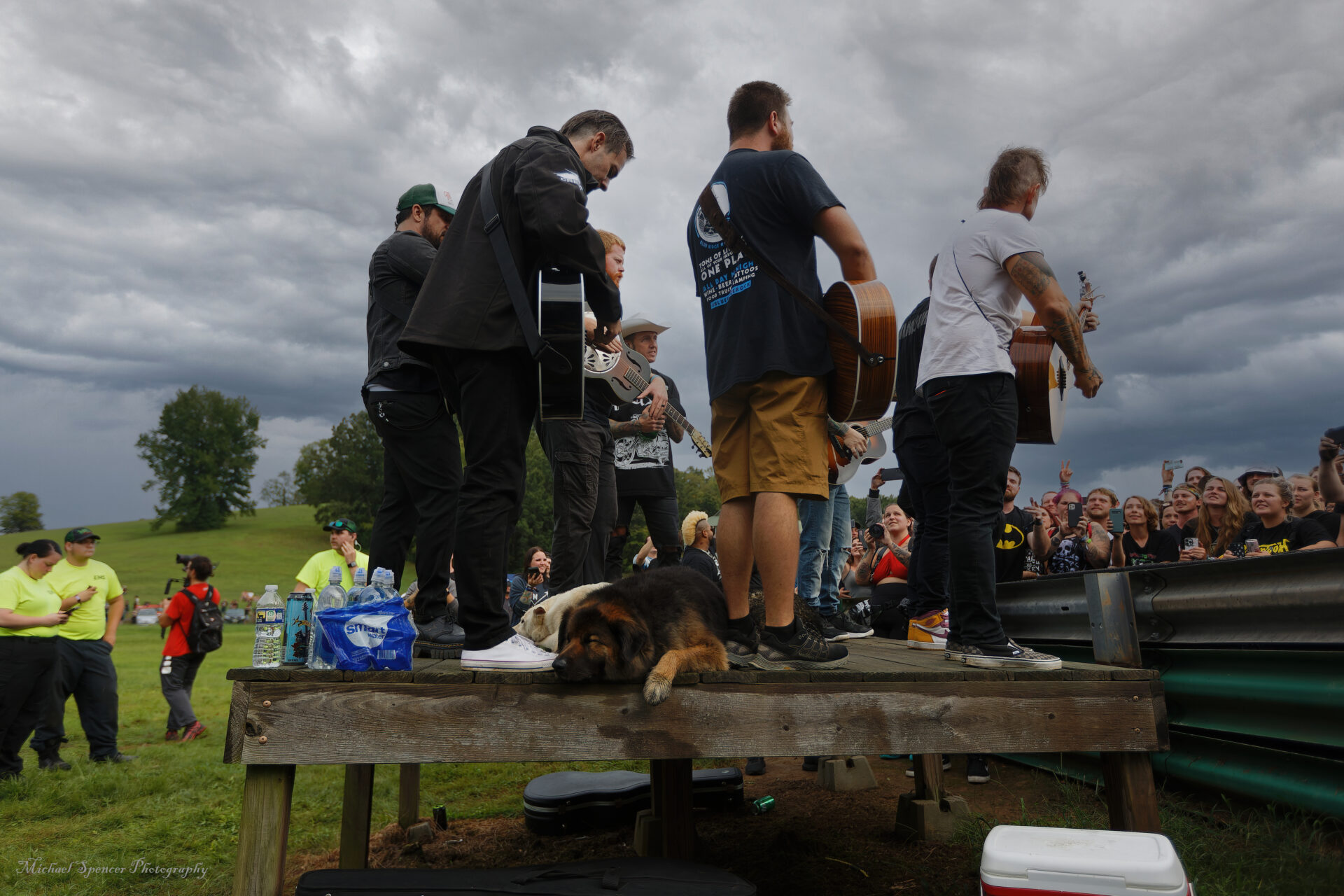 having fun now, so back to the sliding. About an hour and half later, they announce that the days shows have been cancelled due to weather. It hasn’t rained, there was no wind, no lightning and the people are a bit angry. They also said that a decision about Sundays shows would be made around 5:00 PM. I tired of the slip and slide and head back over to my campsite. It’s about 5 and I notice a lot of campers are heading over towards another camping section and someone said they were having an acoustic popup show in the campground. I grab my camera and head that way. I get over there and head ”backstage”, mind you this is up against a guardrail on the side of a racetrack and there is nothing