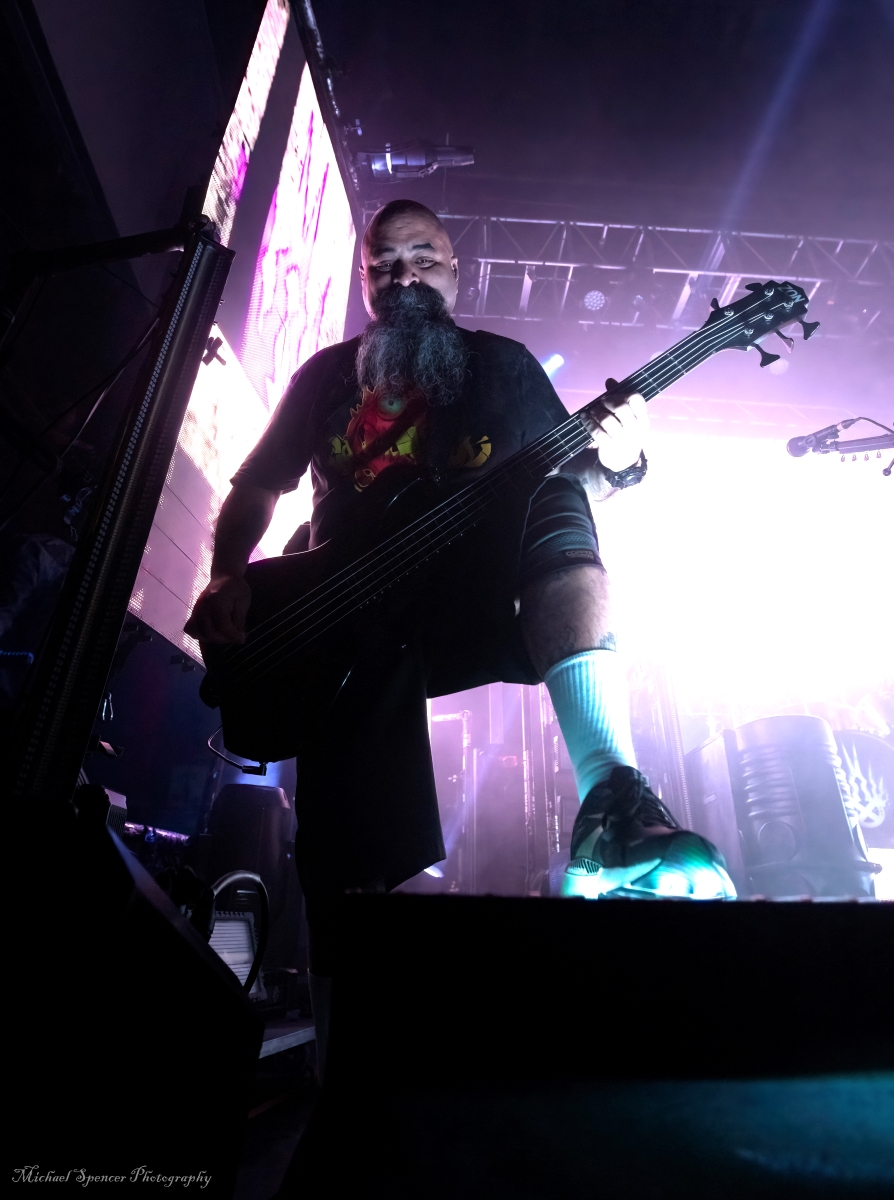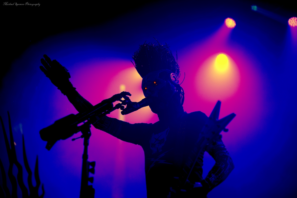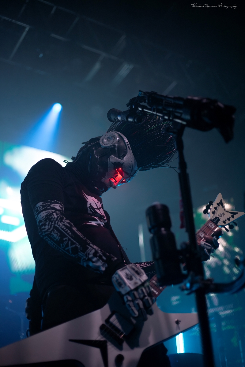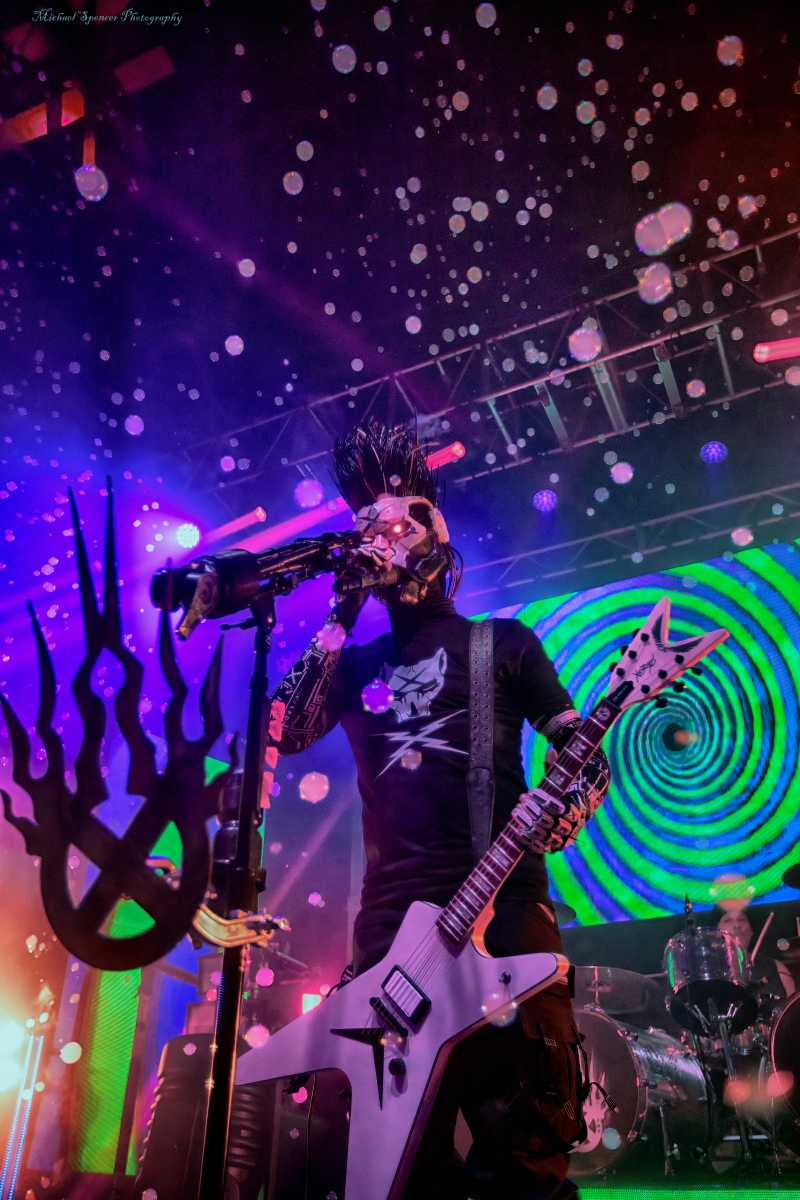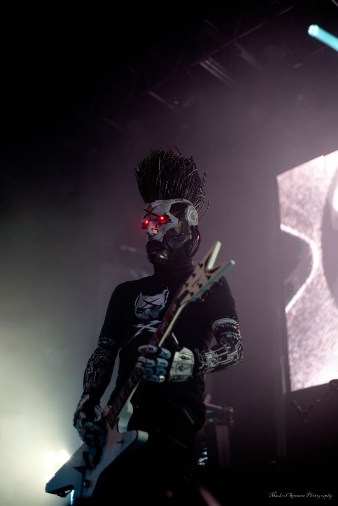 And then it was time to changeover for Static-X. Static-X was formed in 1994 in Los Angeles, California by Wayne Static (vocals) and Ken Jay (drums) after the two moved to LA. They rounded out the band with Tony Campos on bass and Koichi Fukuda on guitar. They went thru some lineup changes and breakups over the years and released 6 albums before the untimely death of Wayne in 2014. The band had essentially broken up in 2009 and after Waynes’s death, the three remaining original members decided to reform and release an album of music that they had recorded with Wayne and invited some guest vocalists to contribute, one of them being longtime friend Edsel Dope. This is titled Project: Regeneration Vol. 1 and was released in 2020. And then they decided to tour. But Wayne was gone. Enter Xer0. A masked singer, wearing a mask that looked very much like Wayne, and worn by someone they declined to identify. It was rumored to be Edsel, but he denied it. Later, he did admit he was Xer0. A Static X show is a spectacle in and of itself. Quite often, you find a great live band musically, but lacking in stage show, or vice versa, a great show, but lacking in musical skills. Let me assure you, Static X has both covered. Durin the changeover, they build the anticipation with house music such as Neil Diamonds Sweet Caroline, which got the audience singing, followed by Walk by Pantera and then Time Warp from The Rocky Horror Picture Show. And then the lights go down, the smoke machines fill the room, all you can see on the stage are two red, glowing eyes, and the lights come you, and…. Bubbles, lots of bubbles. And then you notice a robotic creature with a grin, that quickly turns into a snarl, and he is shooting bubbles everywhere. And the music starts. What has been described as every form of metal to ever exist, my best description would be if Pantera and Ministry had a child, that child would be Static-X. They start off with Hollow and follow with Terminator Oscillator and run through a 16-song set that will leave you confused, conflicted and ultimately, content. There is mayhem at every turn, and you can tell that they are very good at what they do. This is a theatrical presentation that is set to a good soundtrack. Some bands you go to listen to and others you go to experience. Static-X is the latter. They released Project: Regeneration Vol. 2 in January of this year. Their set consisted of: