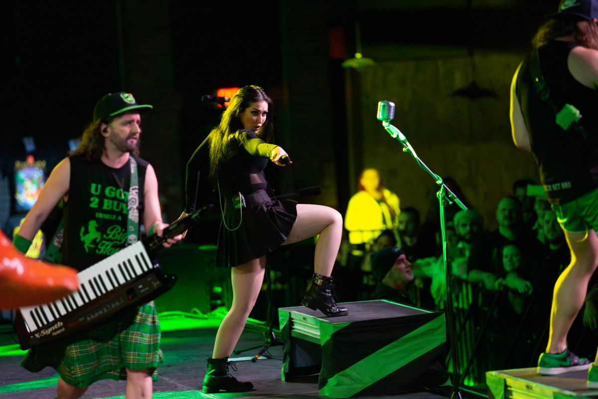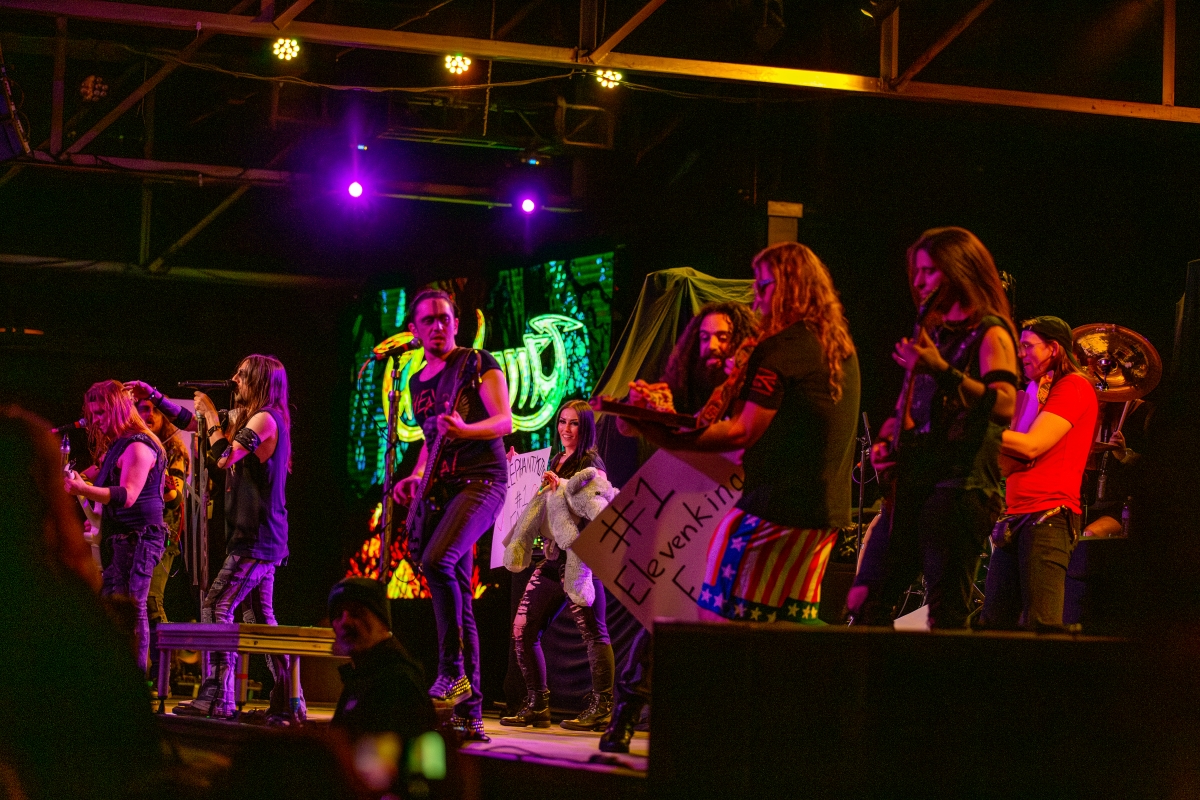 Seeing Glyph and Alestorm members on stage trying to break up the darkness was funny. Members pretended to be the #1 Elvinking fan, and people with huge teddy bears were on stage. We can never forget the pizza party that was delivered by air from the stage. Later in the set, the lead singer was hunted (with Nerf stuff) because of his headgear. These fun-filled antics set the scene for what was to come for the rest of the show.
