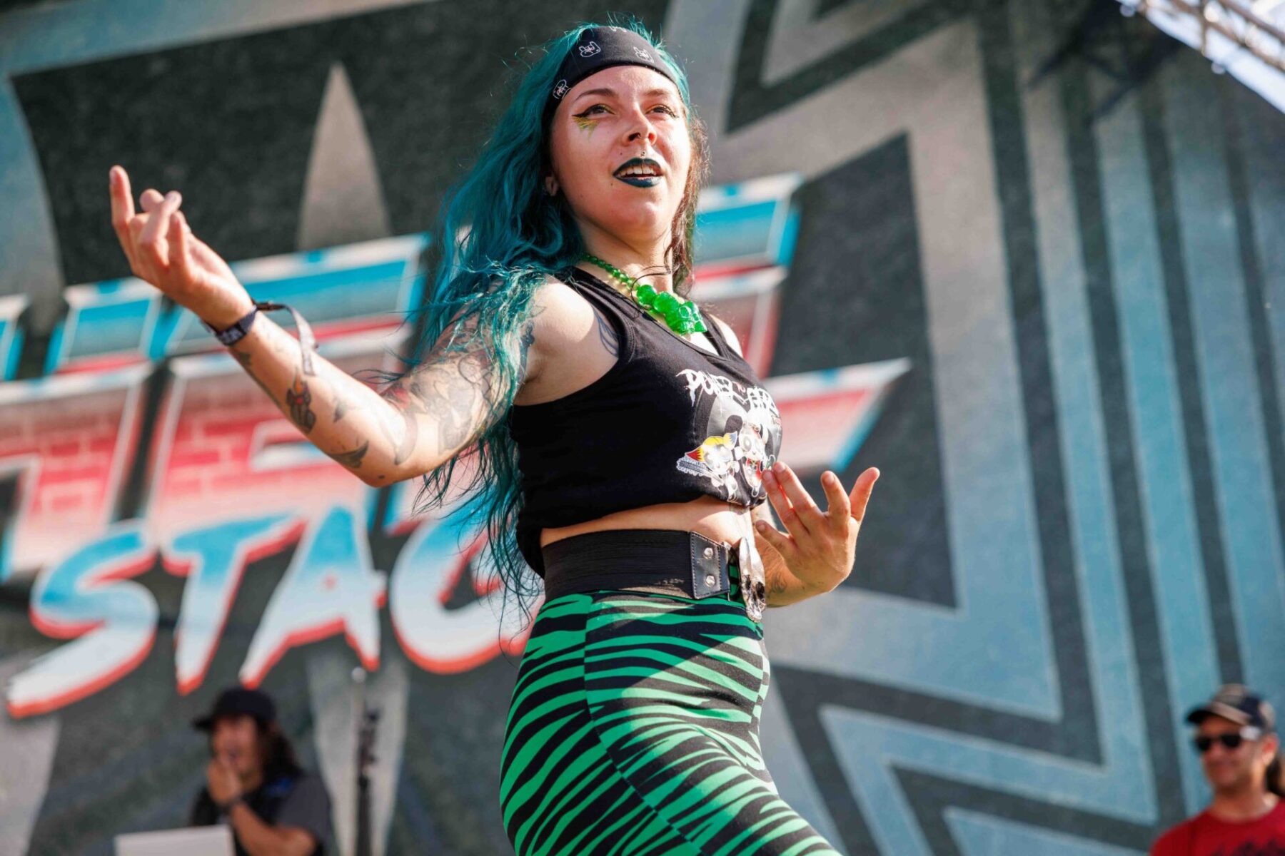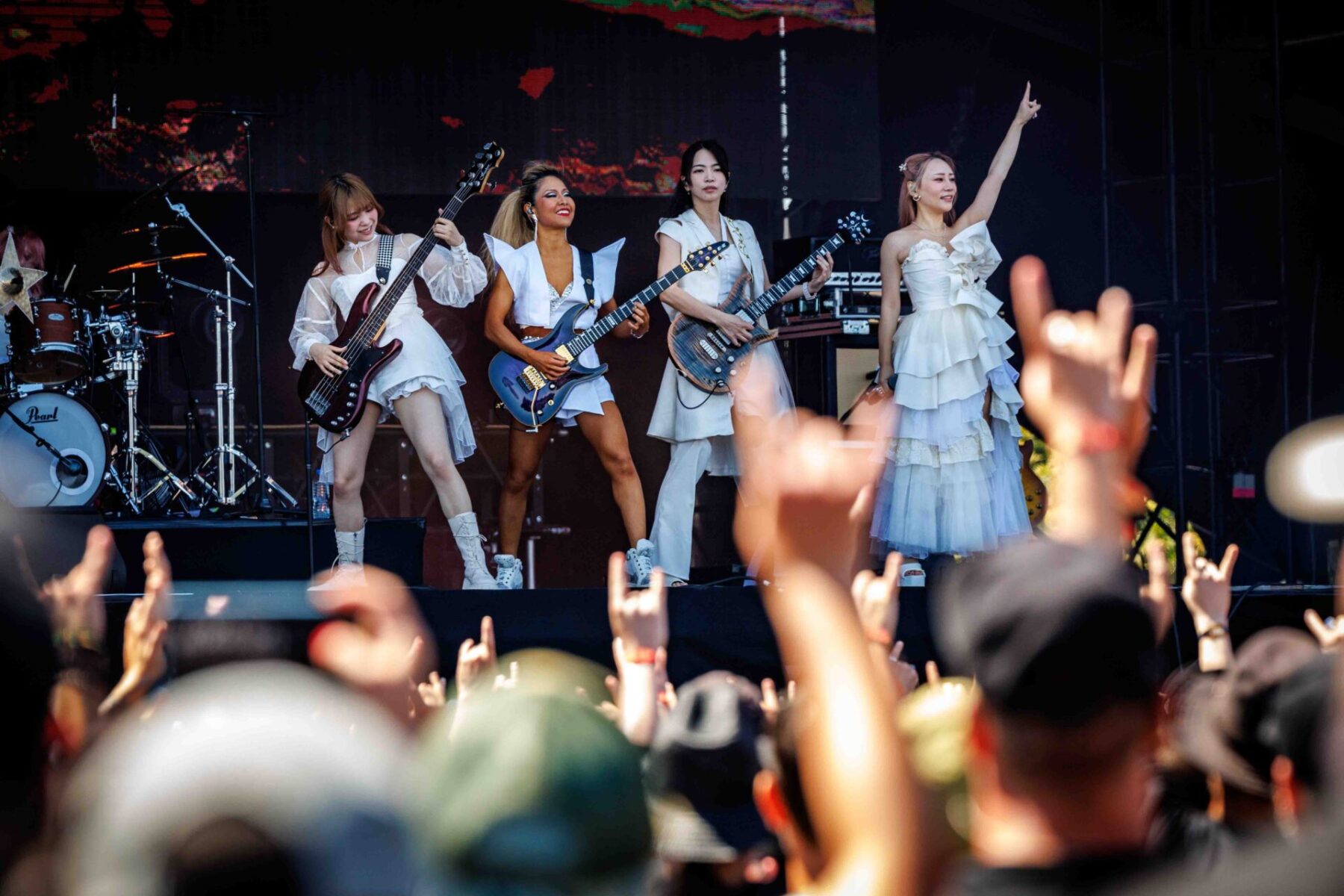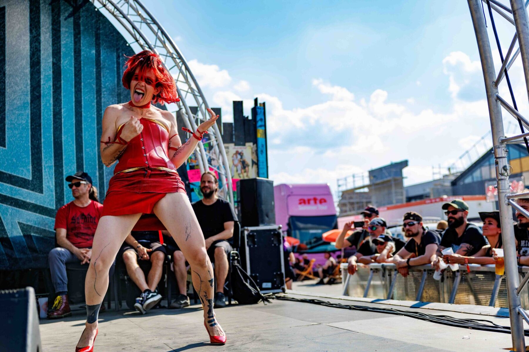 their high-energy performance, blending aggressive riffs and dynamic vocals. Their setlist, featuring tracks like “D.R.I.L.D.O.” and “Fukstar,” showcased the band’s raw intensity and stage presence. The duo’s chemistry and relentless energy captivated festival-goers, solidifying their reputation as a formidable live act. Eyes just could not leave the dynamic supercharged performance of vocalist Milkie Way as she vigorously manoeuvred sometimes leaping across the stage.
