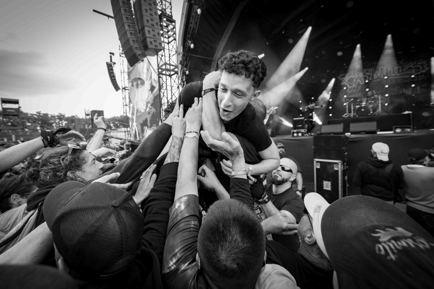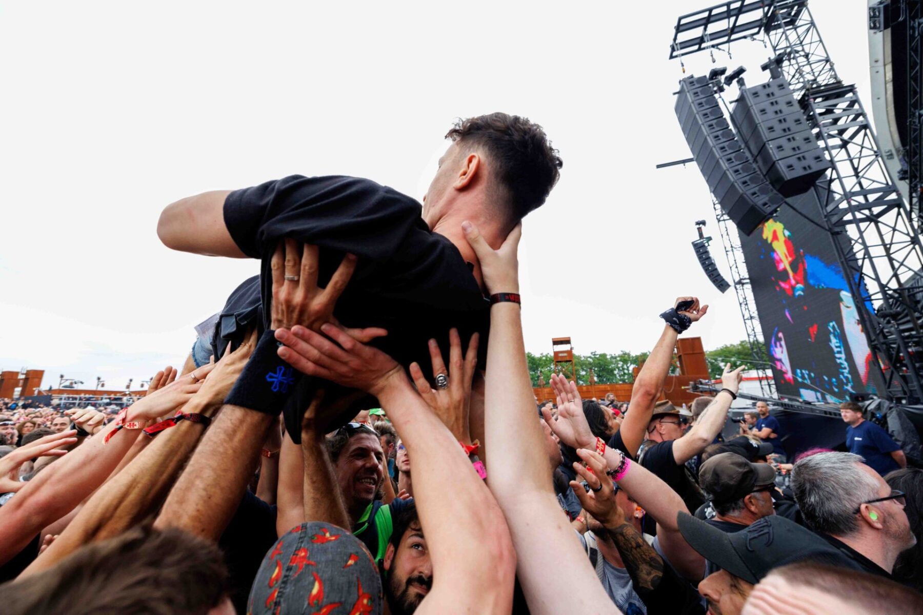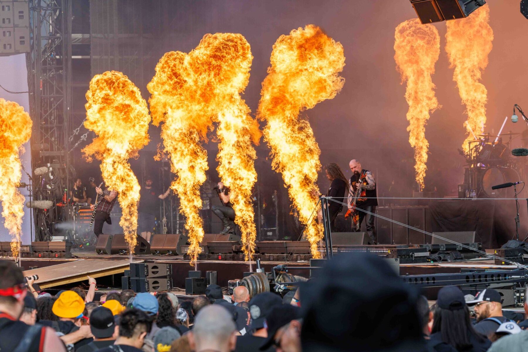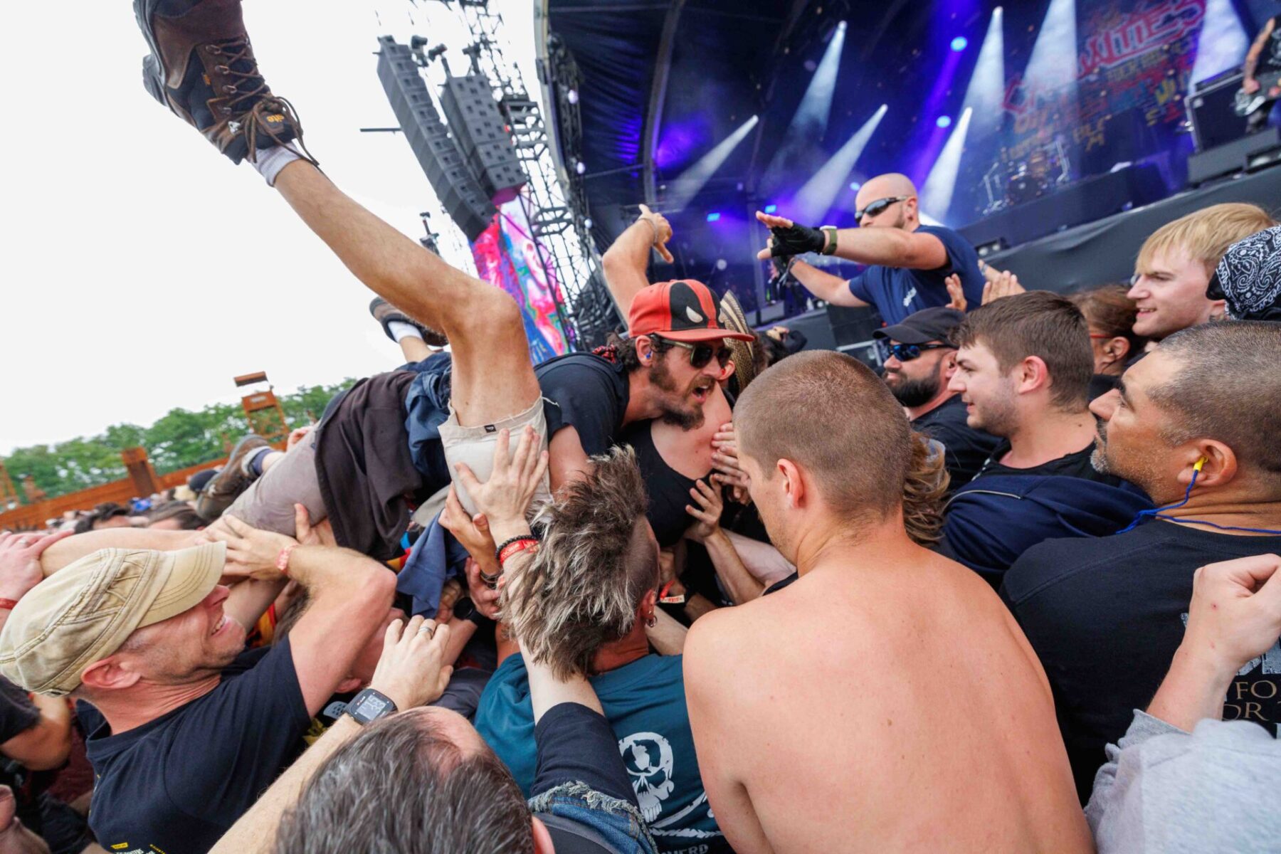 There was not a chance in the world that Slaughter to Prevail were not at the top of my list for bands to see. The demonic gutteral voice of Alex Terrible is a commanding experience leaving you with flashes of visions of the Russian giant when your eyes are closed for days. By far one of the early standout moments during Day 1 occurred during Prevail’s set, which featured Terrible’s attempt to create the largest “Wall of Death” in history. Although it’s always difficult to verify if any record was indeed broken, the viral footage of thousands of fans rushing toward each other added to the chaotic, electrifying atmosphere that Hellfest is known for. Bravely, I managed to place myself in between walls of maniacal infused metal heads as the walls closed in to snap off a few shots ( I have provided these images) Respect and trust being very clear with moshers as this spectacle alone became one of the most talked-about moments of the festival .