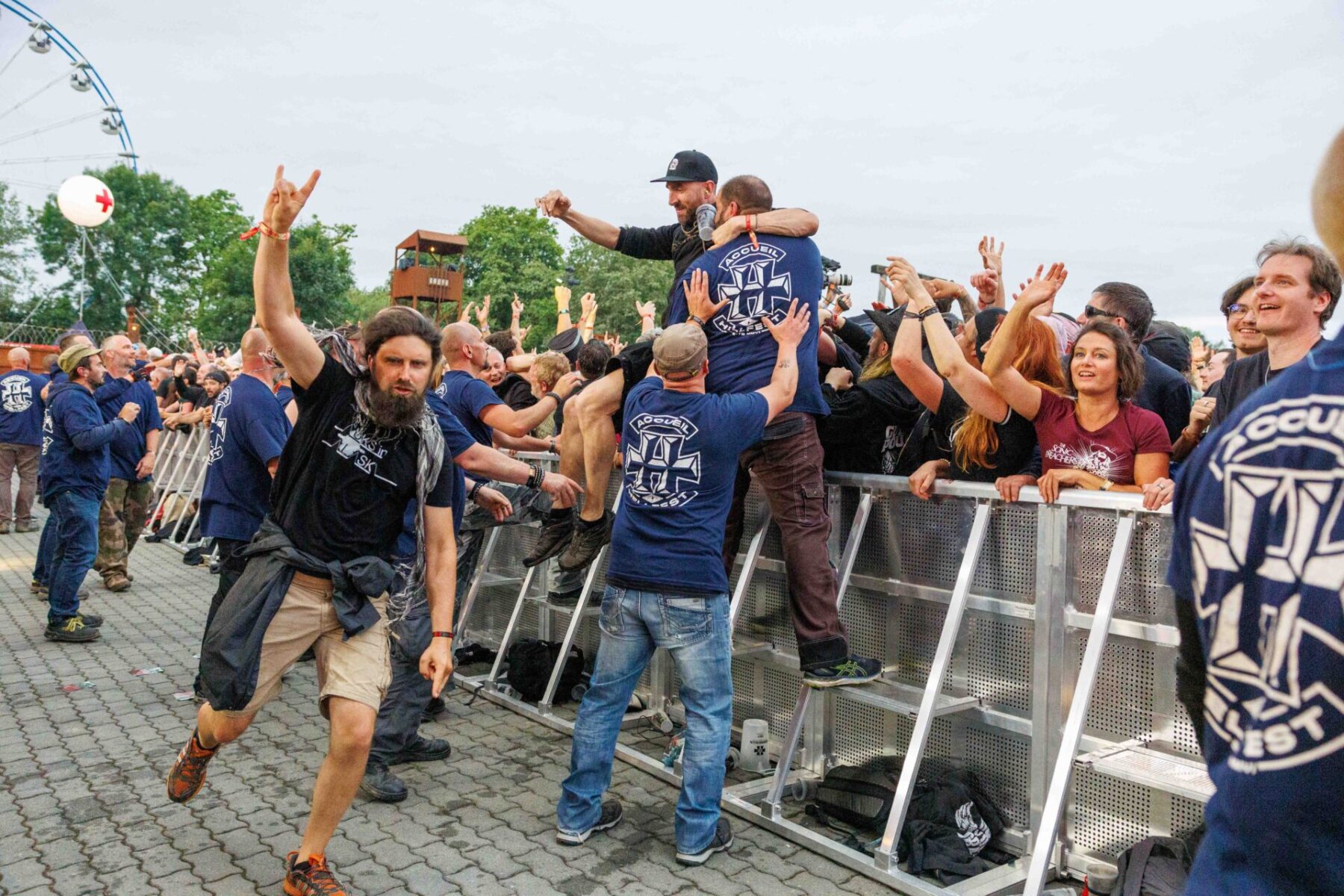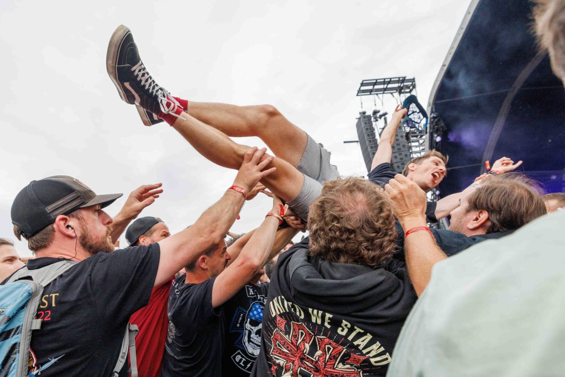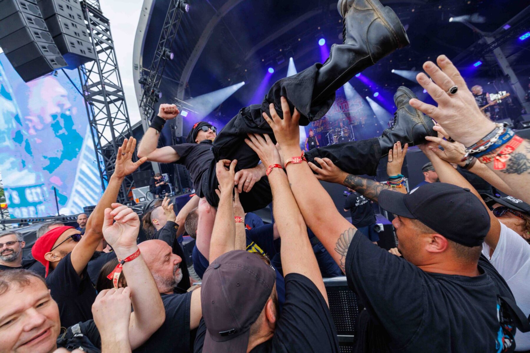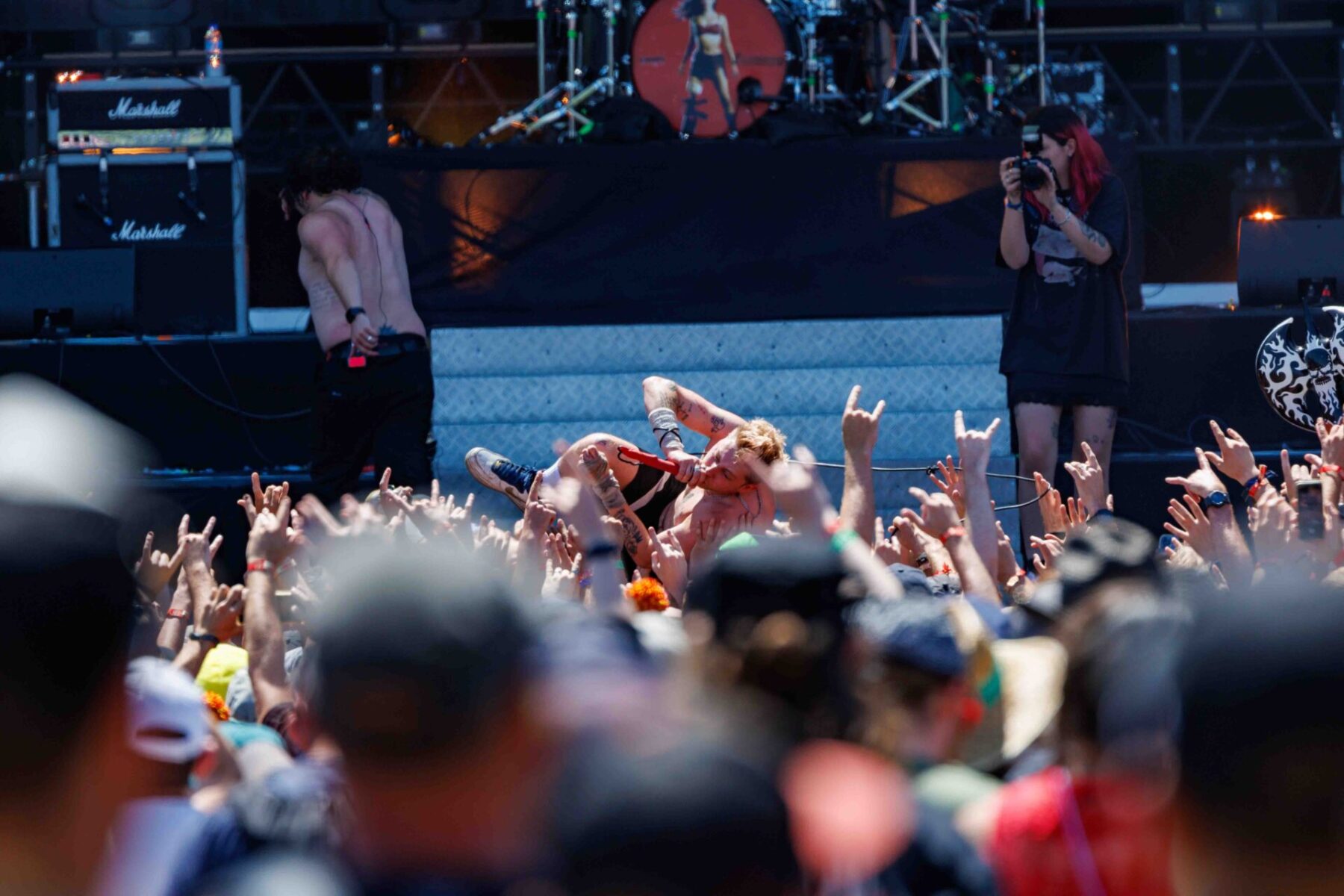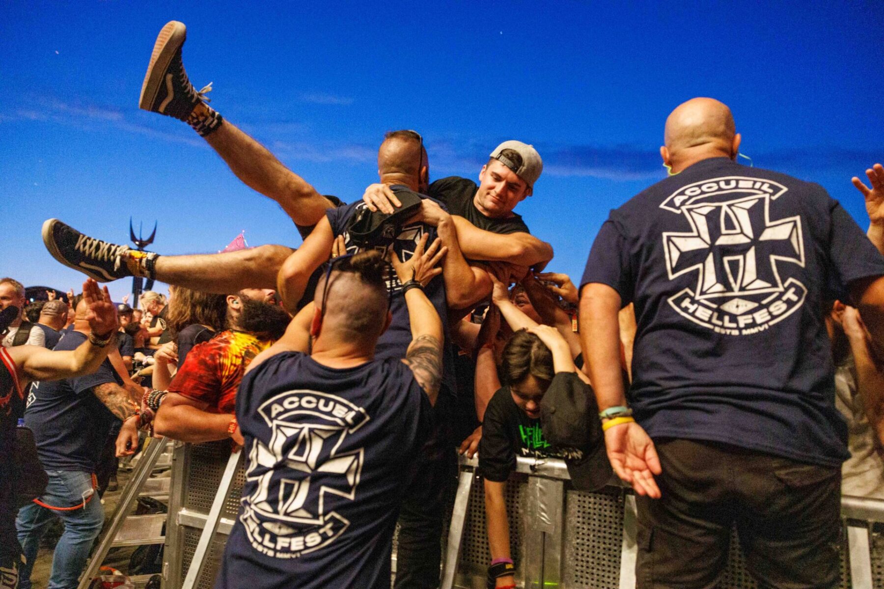 There was not a chance in the world that Slaughter to Prevail were not at the top of my list for bands to see. The demonic gutteral voice of Alex Terrible is a commanding experience leaving you with flashes of visions of the Russian giant when your eyes are closed for days. By far one of the early standout moments during Day 1 occurred during Prevail’s set, which featured Terrible’s attempt to create the largest “Wall of Death” in history. Although it’s always difficult to verify if any record was indeed broken, the viral footage of thousands of fans rushing toward each other added to the chaotic, electrifying atmosphere that Hellfest is known for. Bravely, I managed to place myself in between walls of maniacal infused metal heads as the walls closed in to snap off a few shots ( I have provided these images) Respect and trust being very clear with moshers as this spectacle alone became one of the most talked-about moments of the festival .