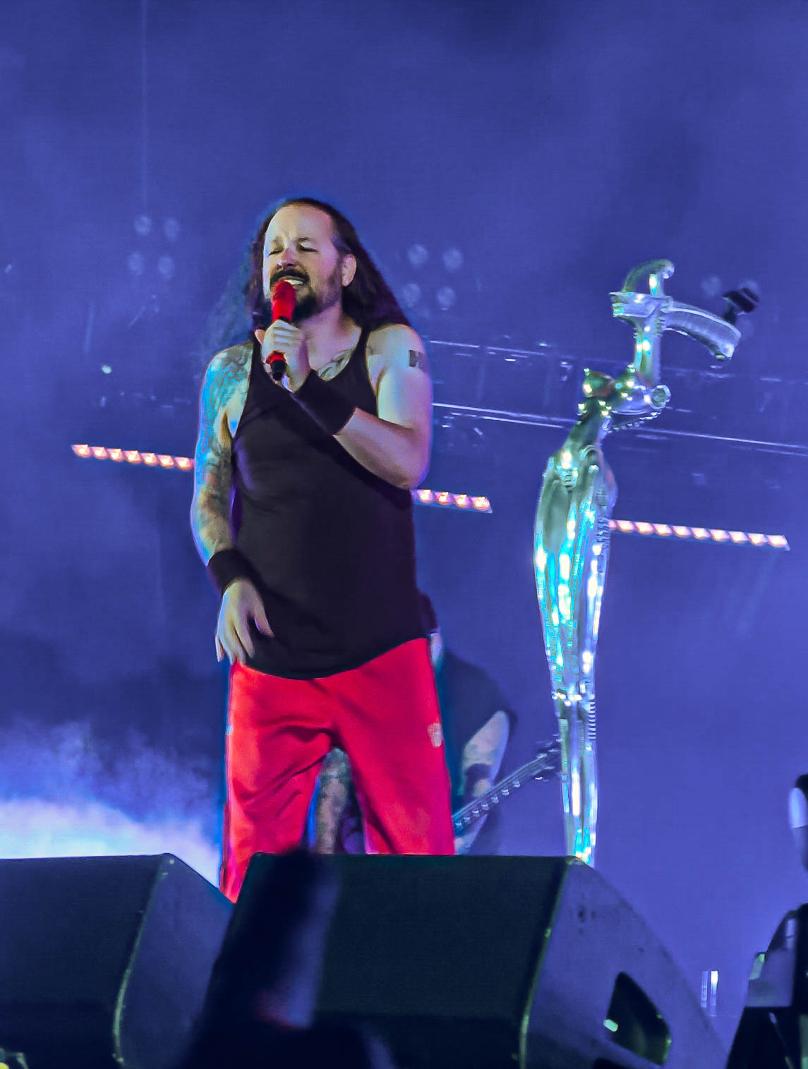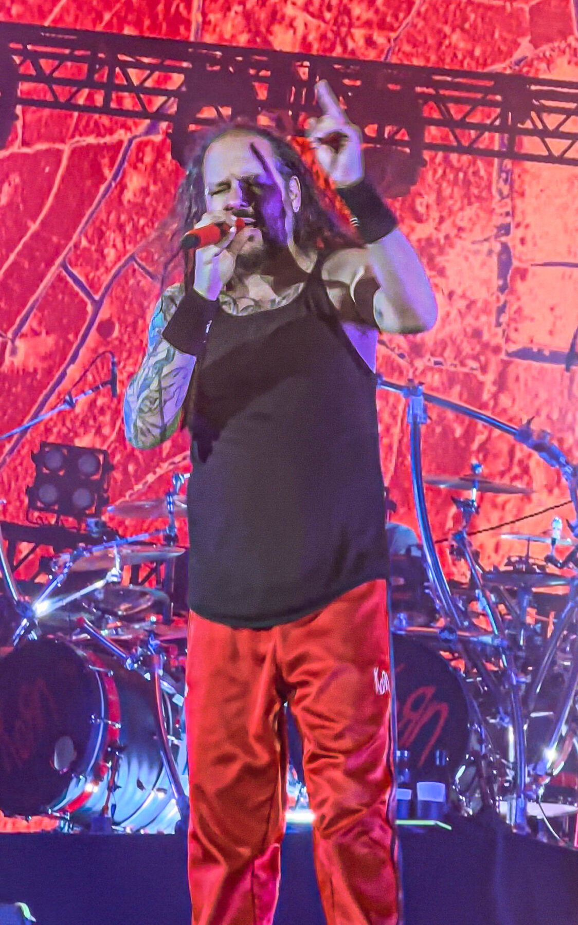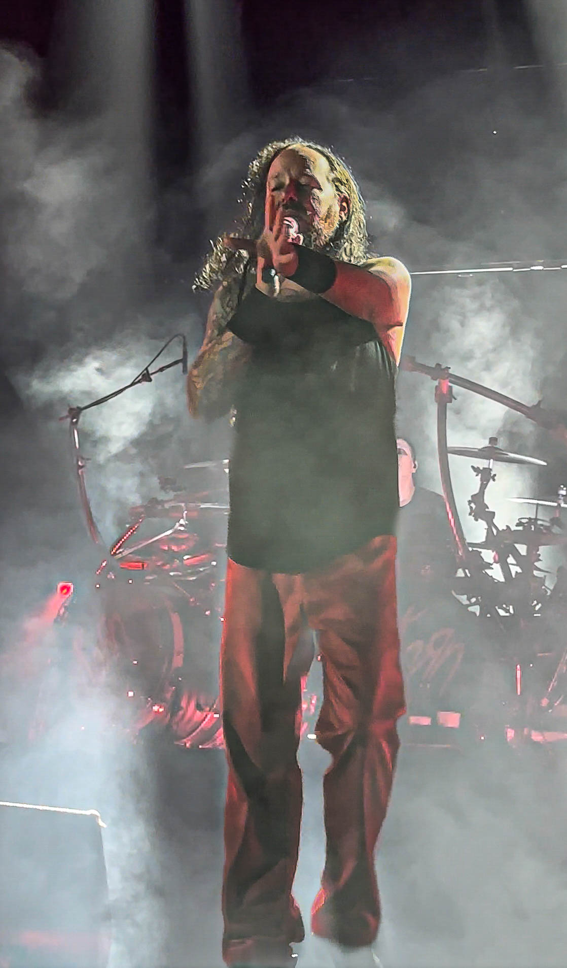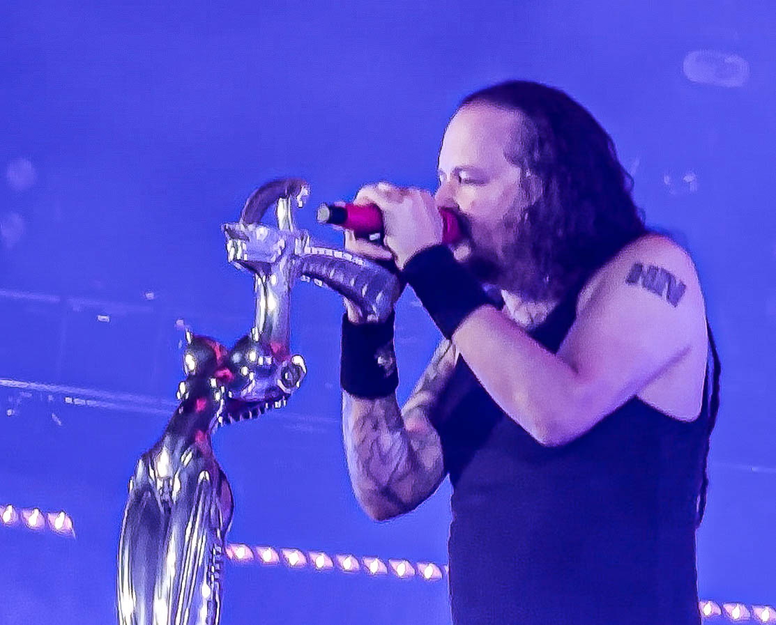Typically, there is no curtain for Korn, but this time, they raised one. When the lights went down and the sounds that only Korn can produce started, the crowds began to turn into a sardine can with me right in the middle. I was front row in the general admission area, just