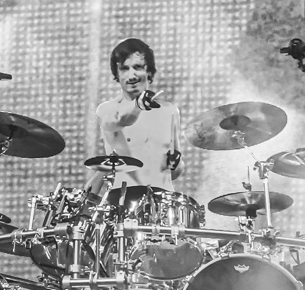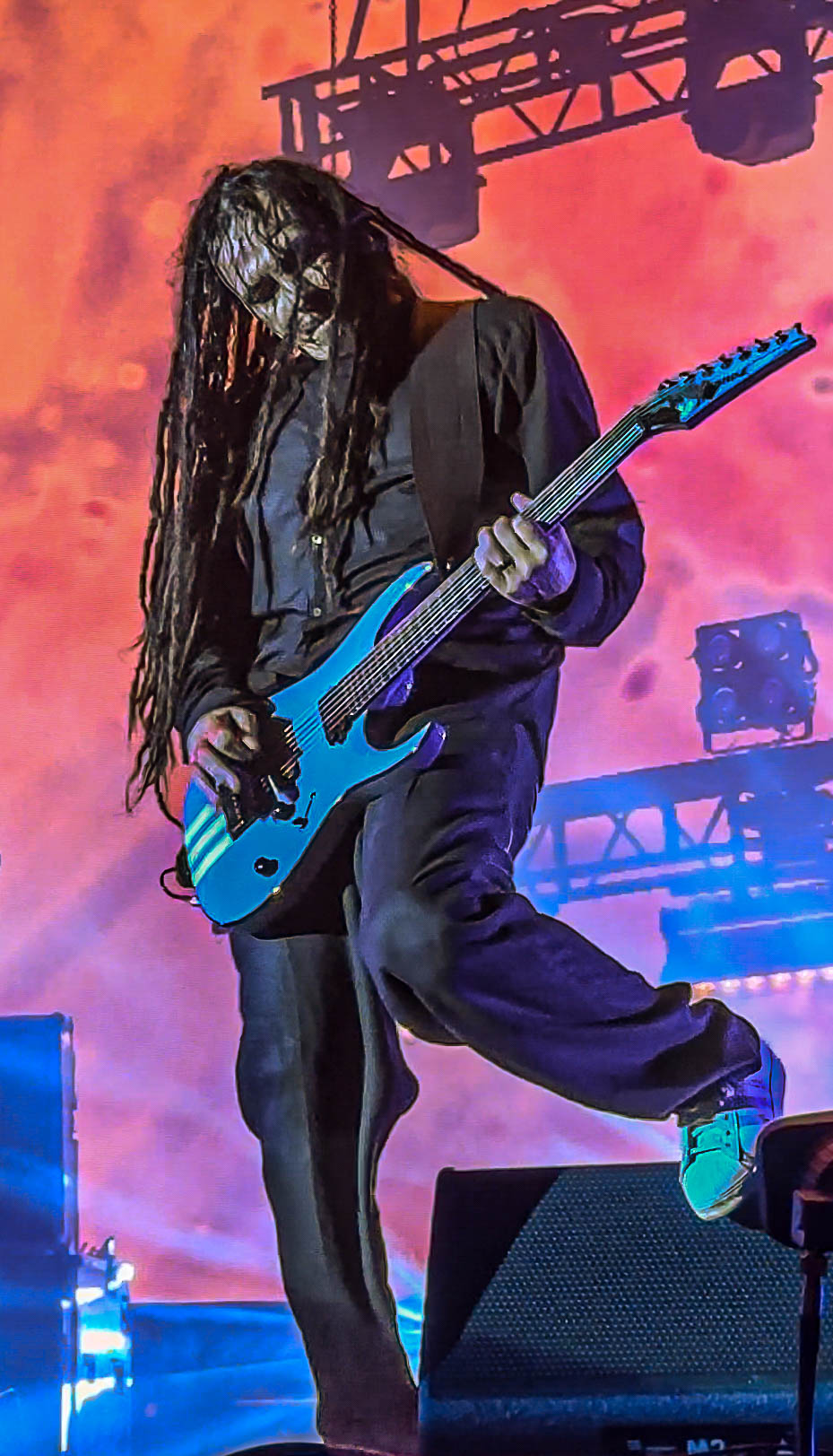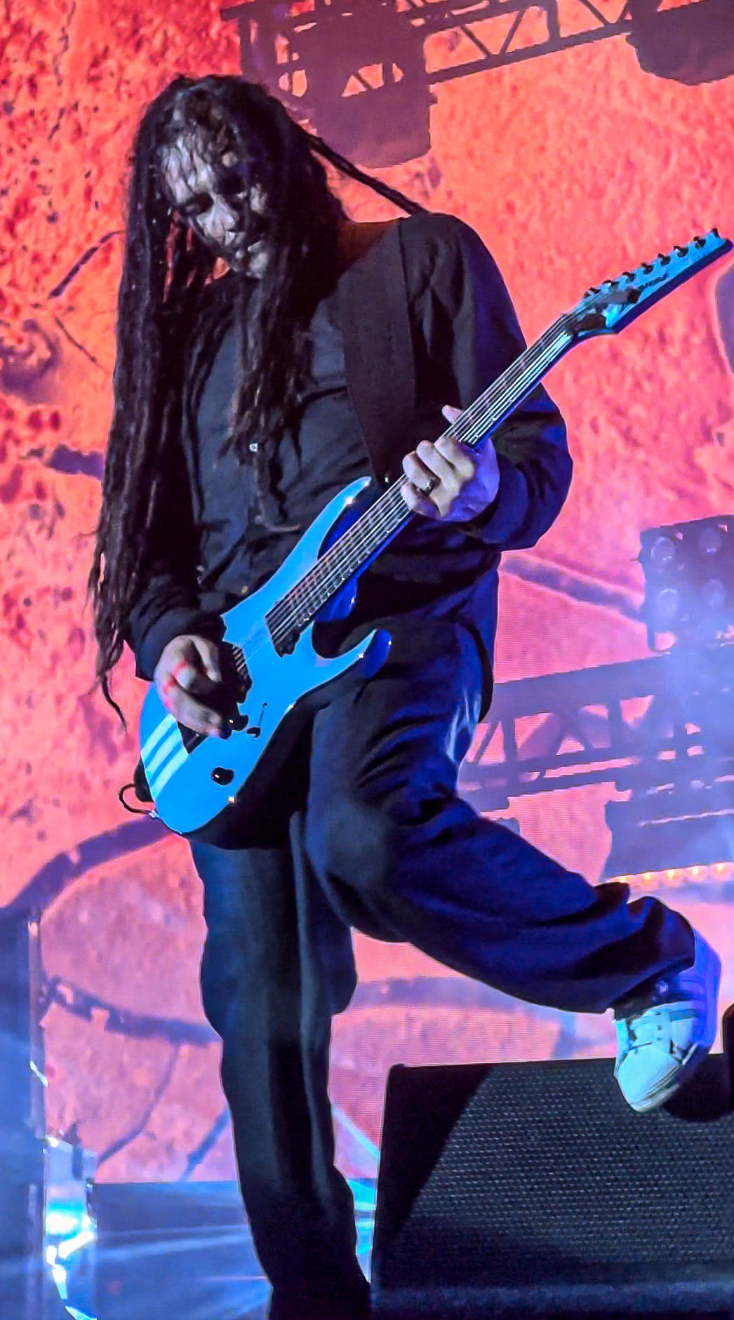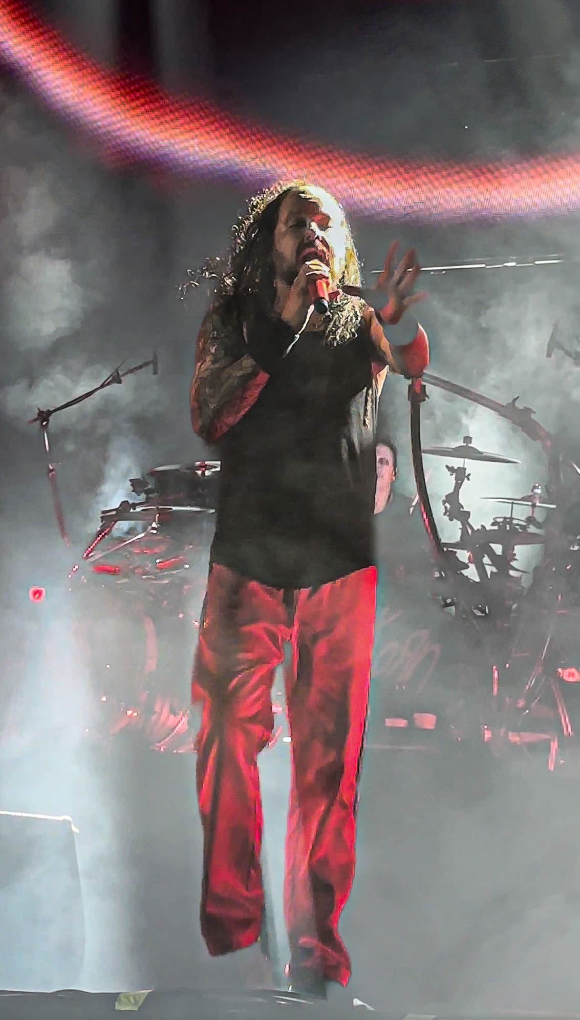 Typically, there is no curtain for Korn, but this time, they raised one. When the lights went down and the sounds that only Korn can produce started, the crowds began to turn into a sardine can with me right in the middle. I was front row in the general admission area, just