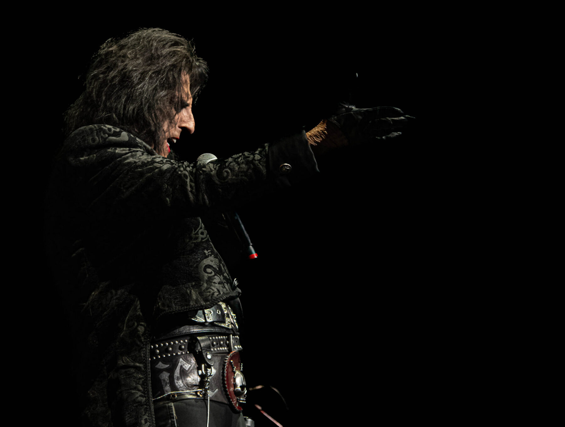 between any of them, and it’s clear he’s in his usual great voice. The musicians are hammering out the songs but you can’t dance and it doesn’t feel especially right to sing when seated and the acoustics as they are because you’re not going to sound as good as he does, but you will succeed in annoying the person next to you. The music is full of energy, something which the band and Alice still have in abundance mind, and hit after hit abound, highlights including “Hey Stoopid”, “I’m Eighteen”, the anthemic “Poison” for which we get the first interaction with the audience on song 17, and my young lady’s personal favourite “Bed of Nails”. There’s antics aplenty too, one of which caught me completely off guard, when what I thought was a real photographer jumped up to get a close up picture on the stage only to be run through by Alice brandishing a sword cane! Whips, a very suspicious doll, and even a pulpit, as well as the (these days) obligatory python/ not so feathery boa, cunningly snuck on stage between songs for ‘Snakebite’ while the arena was in darkness. Nicely done!