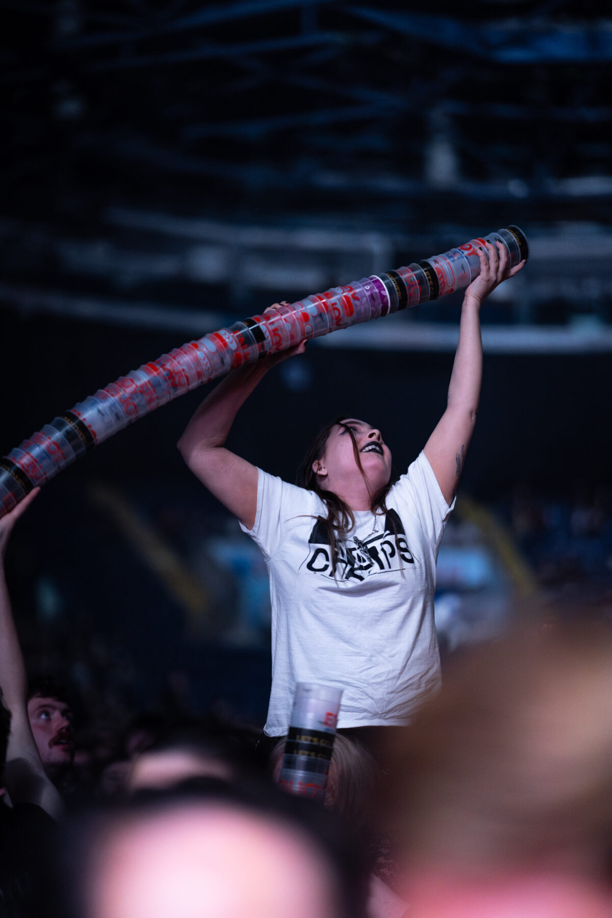 It feels worth noting that between acts (and occasionally during) many fans in the standing pit had taken it upon themselves to create cup towers to pass the time, because what else would you do with hard plastic cups in such a huge crowd? This whole ordeal was so amusing it was like a whole other support act in itself! The poor fans in the middle were getting cups lobbed at them left, right and centre as everybody wanted in on the action. Gig goers became the main attraction as they stood on their mates’ shoulders to add another cup to the 10ft tower, and were met with cheers every time they were successful. Unfortunately security took the cups away in the end (which got them very loudly booed).
