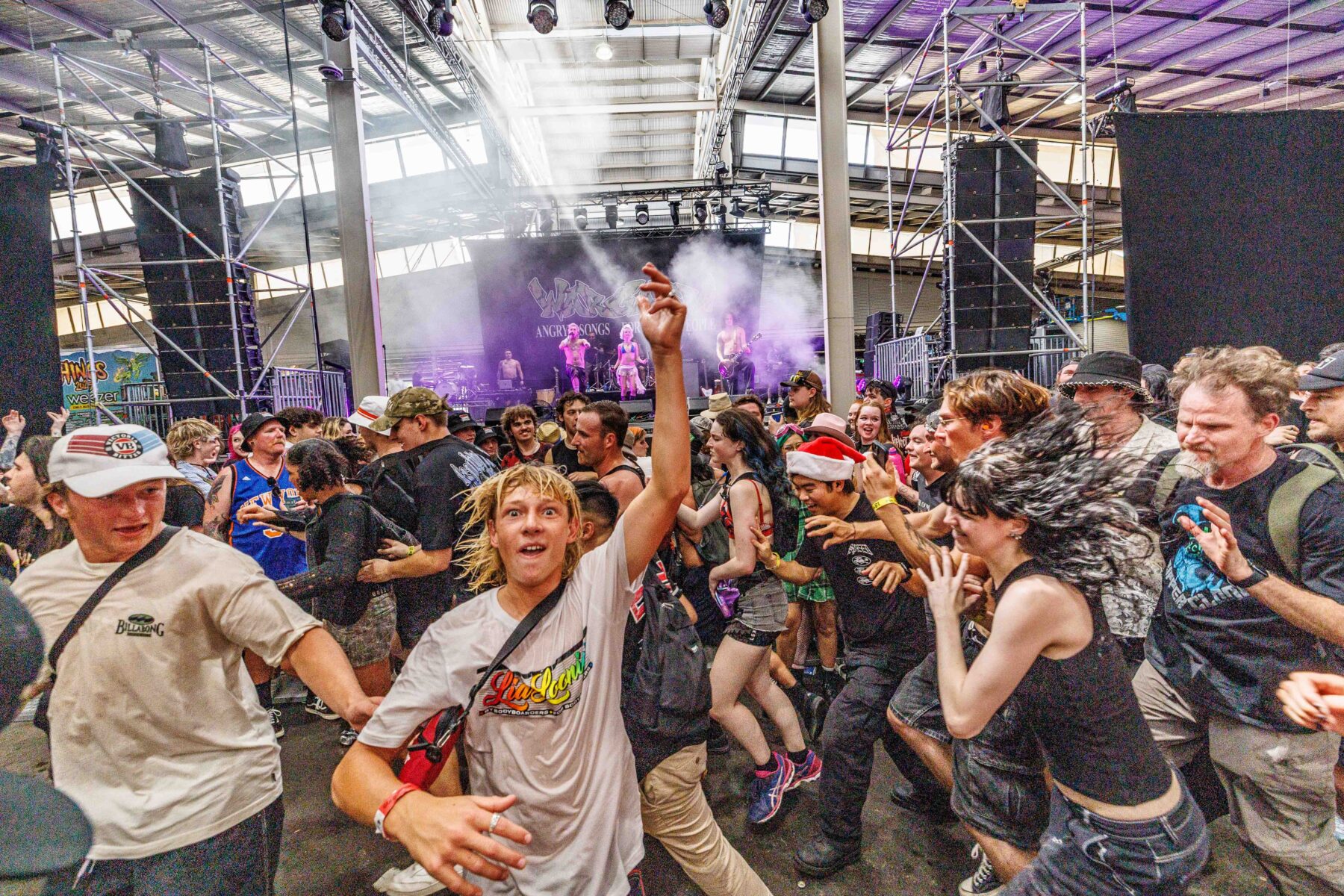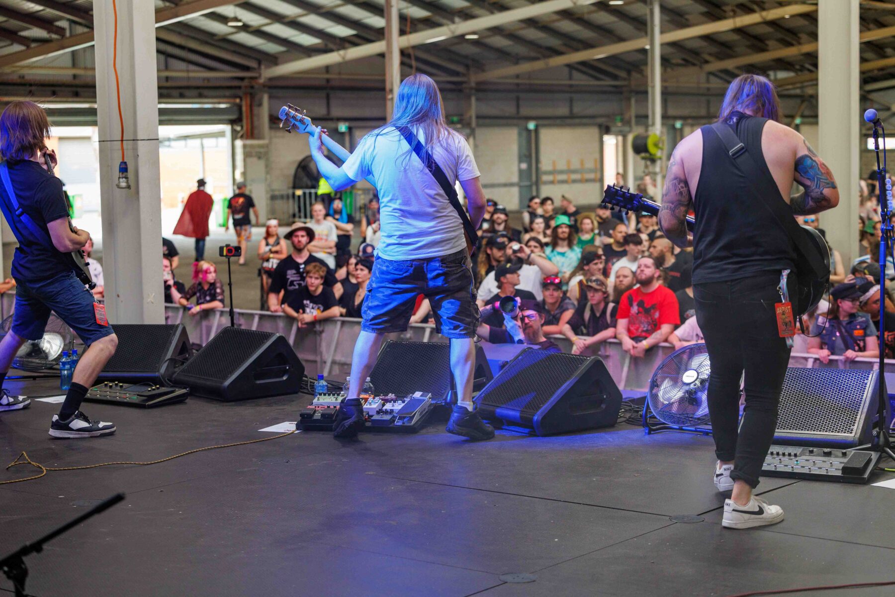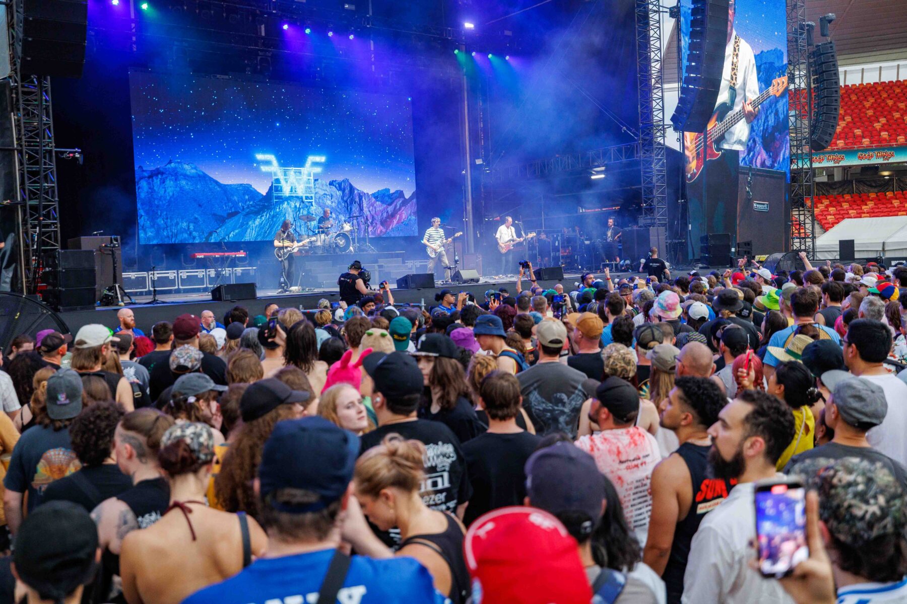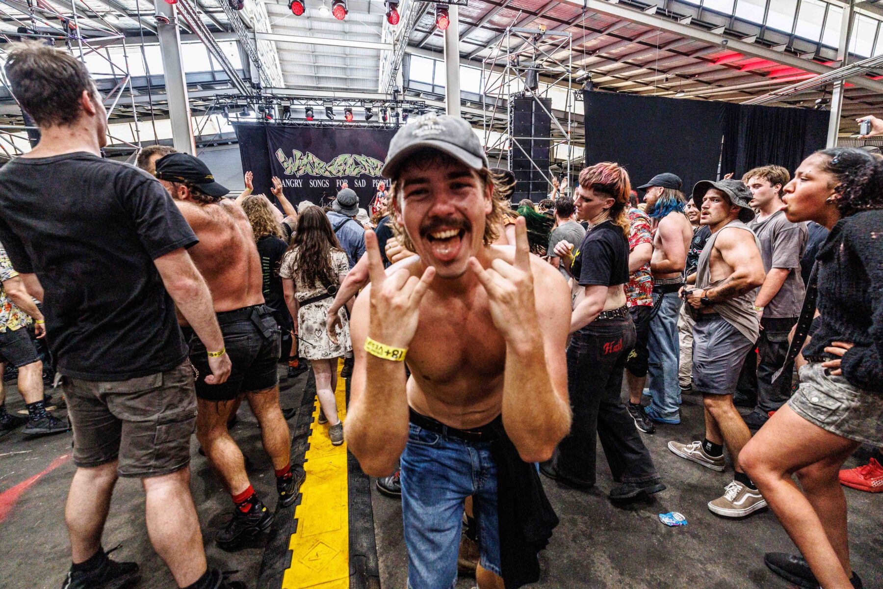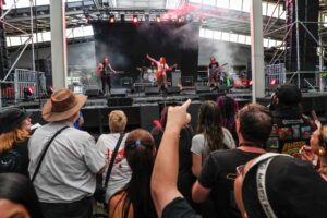 The day began under a merciless wave of heat, pushing everyone’s sunscreen to its absolute limit. Early sets became something of a badge of honour for both fans and bands, but the festival didn’t buckle. Hydration stations, shade pockets, and the occasional mist spray kept the masses alive long enough for the weather to finally turn in their favour. By late afternoon, a cool change drifted in, relieving the crowd and igniting a second wind that carried straight through the night. As temperatures dropped and stage lights rose, the Showgrounds transformed into a vibrant, electric nightscape—exactly the setting you want for a festival hitting its stride.