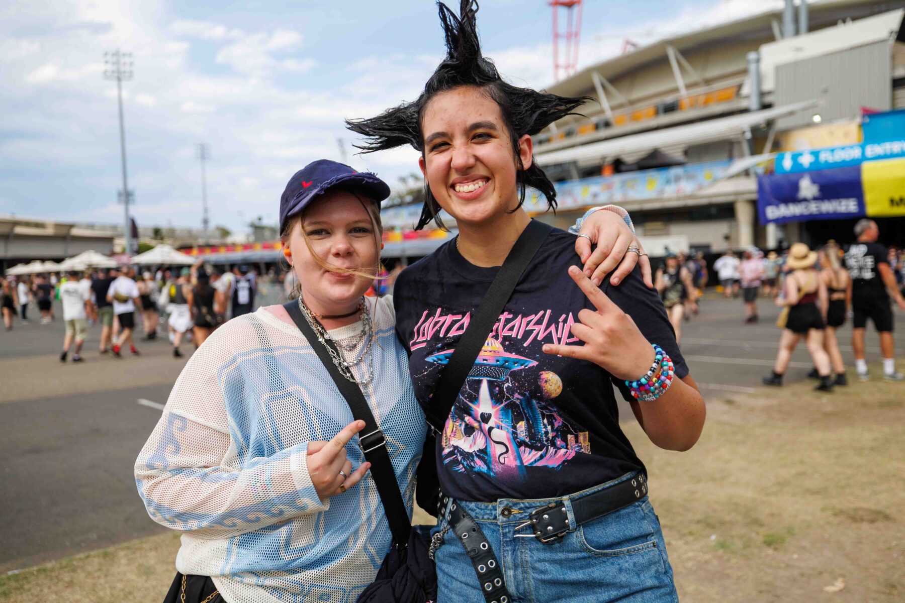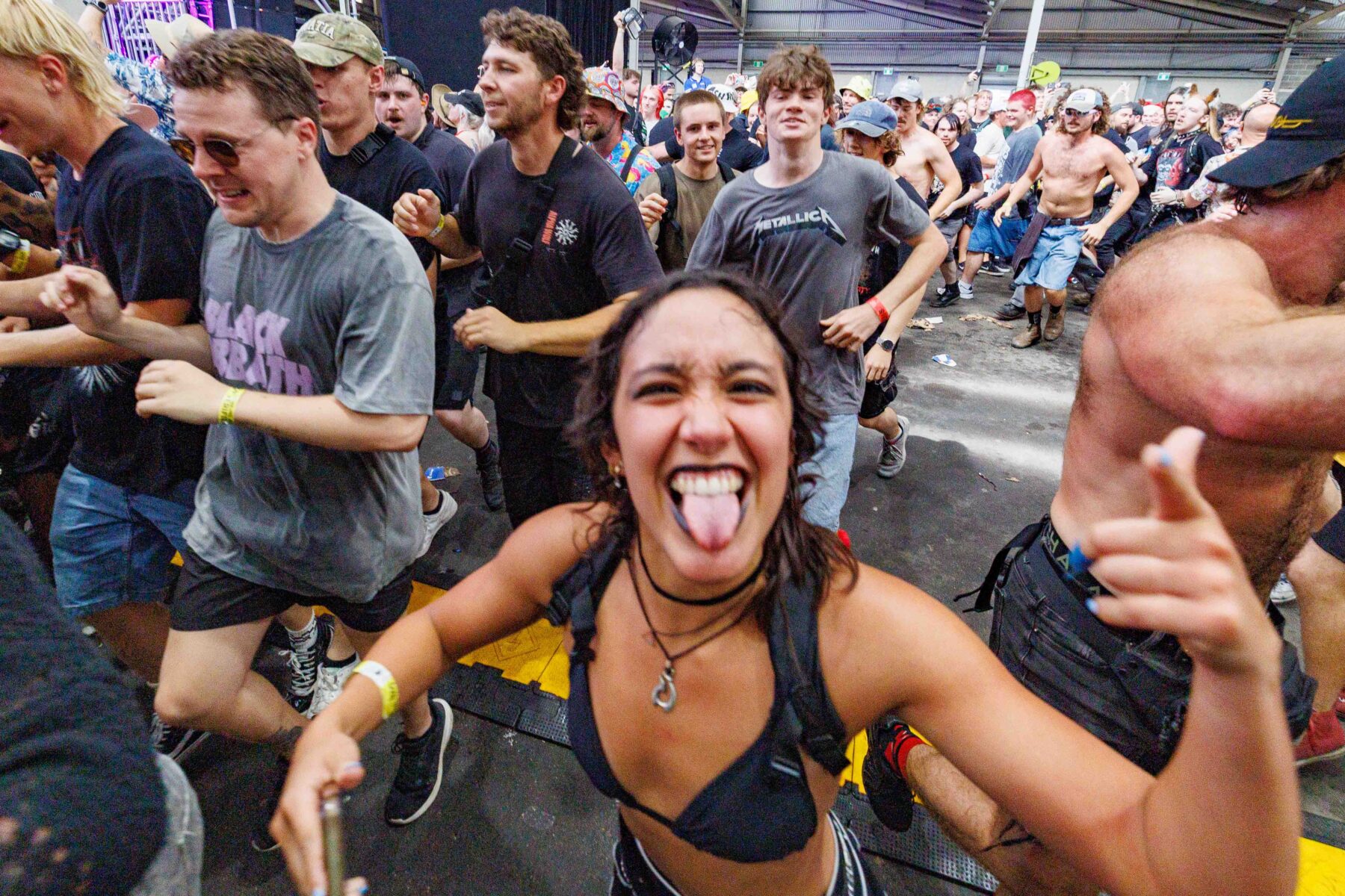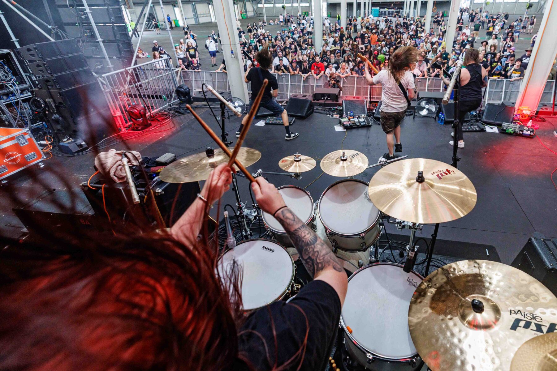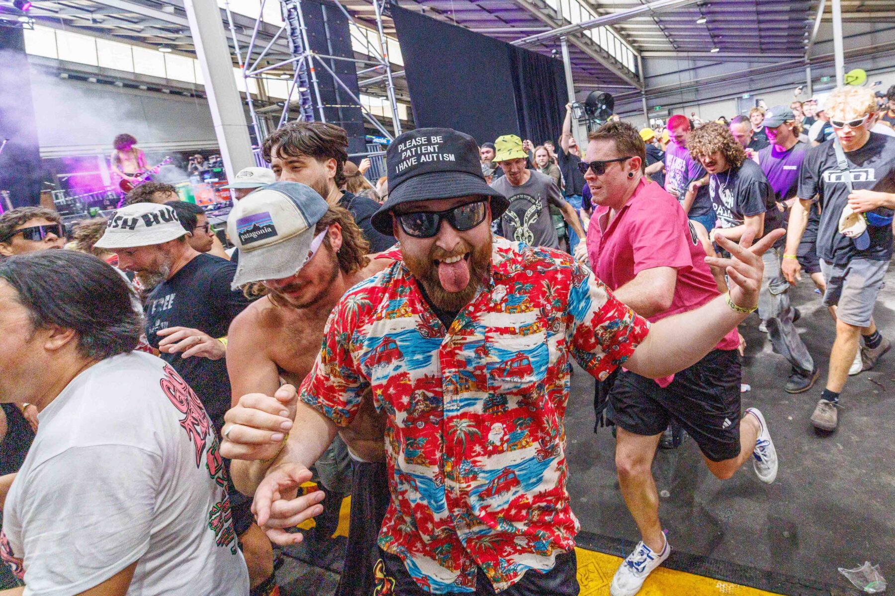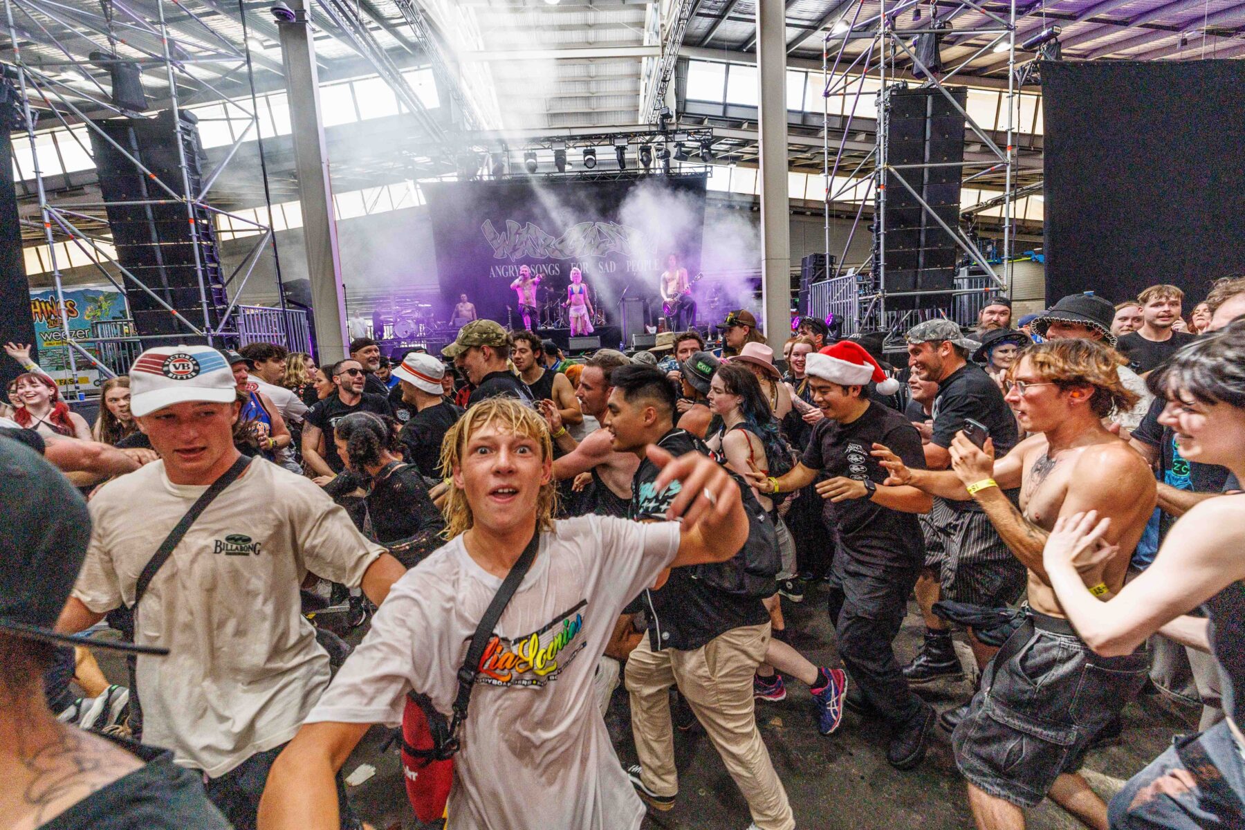 The day began under a merciless wave of heat, pushing everyone’s sunscreen to its absolute limit. Early sets became something of a badge of honour for both fans and bands, but the festival didn’t buckle. Hydration stations, shade pockets, and the occasional mist spray kept the masses alive long enough for the weather to finally turn in their favour. By late afternoon, a cool change drifted in, relieving the crowd and igniting a second wind that carried straight through the night. As temperatures dropped and stage lights rose, the Showgrounds transformed into a vibrant, electric nightscape—exactly the setting you want for a festival hitting its stride.