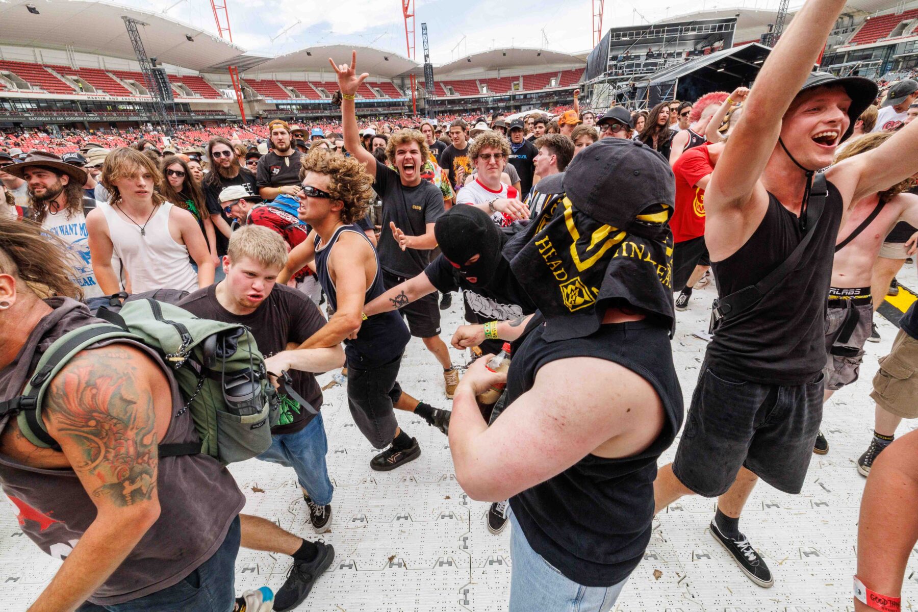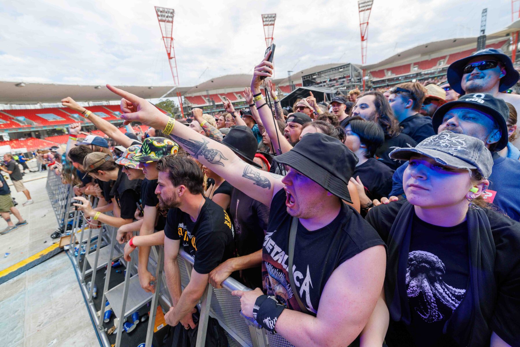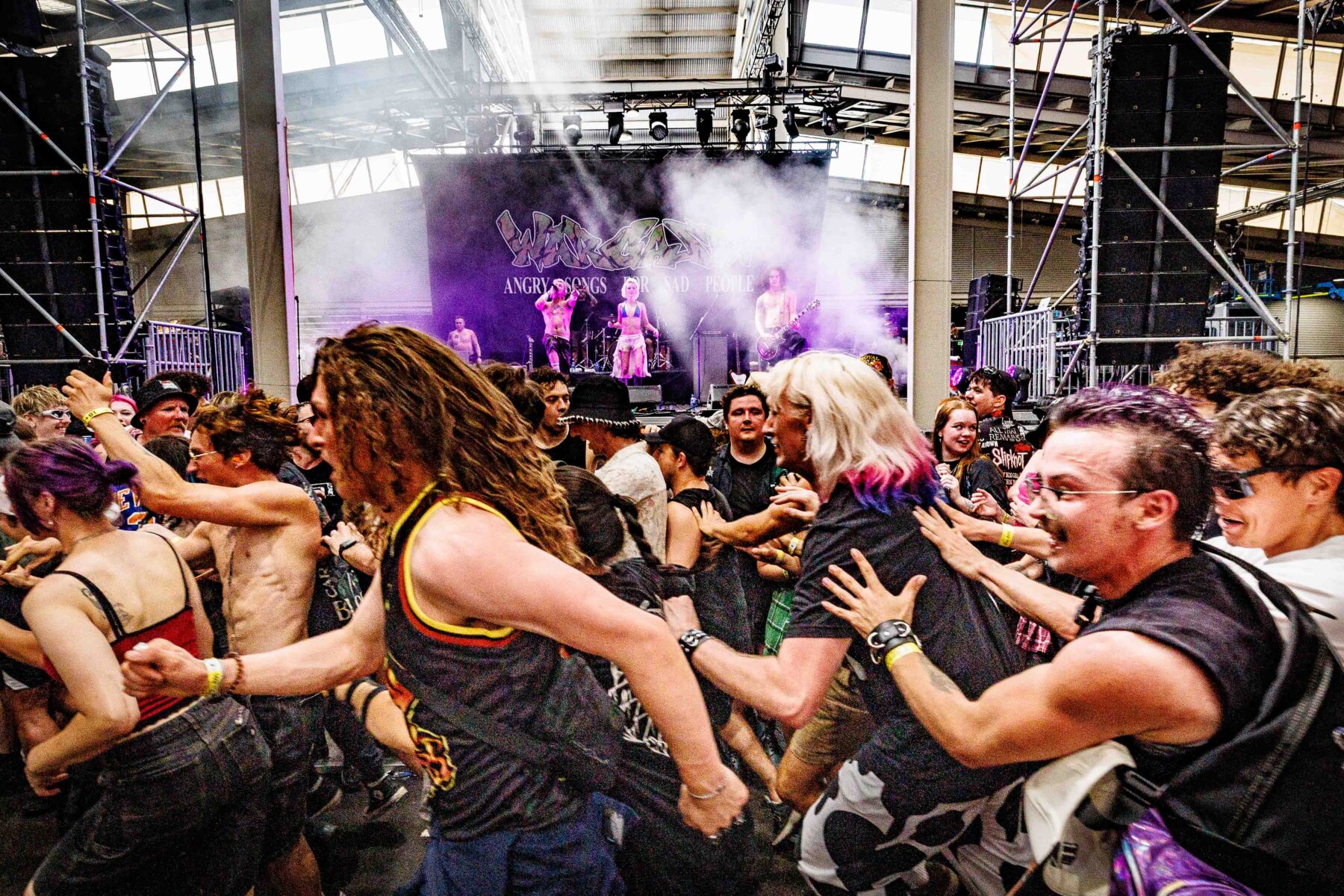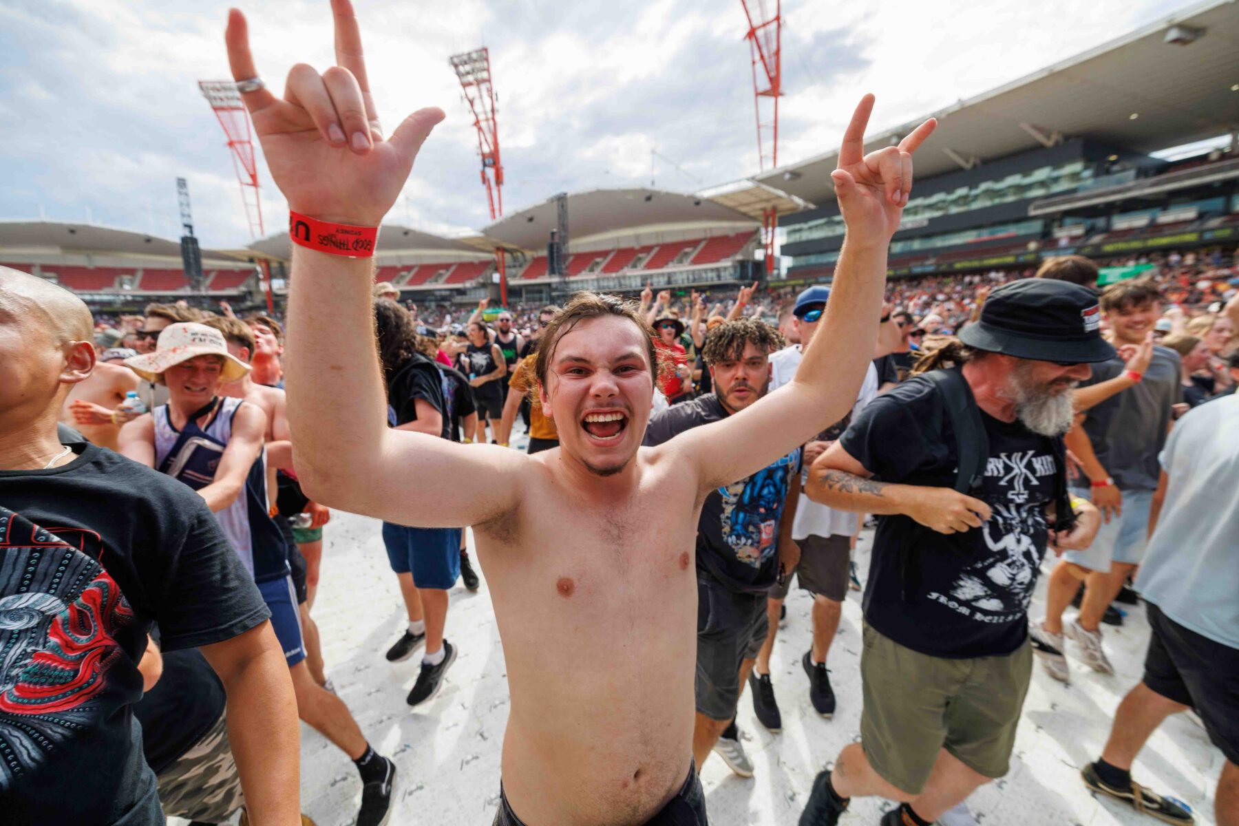 The day began under a merciless wave of heat, pushing everyone’s sunscreen to its absolute limit. Early sets became something of a badge of honour for both fans and bands, but the festival didn’t buckle. Hydration stations, shade pockets, and the occasional mist spray kept the masses alive long enough for the weather to finally turn in their favour. By late afternoon, a cool change drifted in, relieving the crowd and igniting a second wind that carried straight through the night. As temperatures dropped and stage lights rose, the Showgrounds transformed into a vibrant, electric nightscape—exactly the setting you want for a festival hitting its stride.