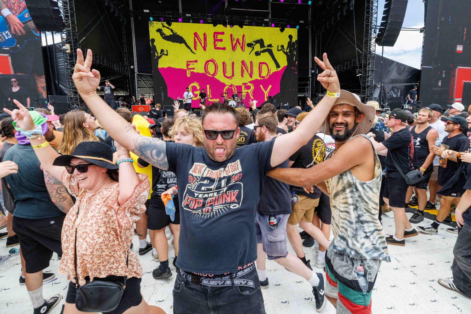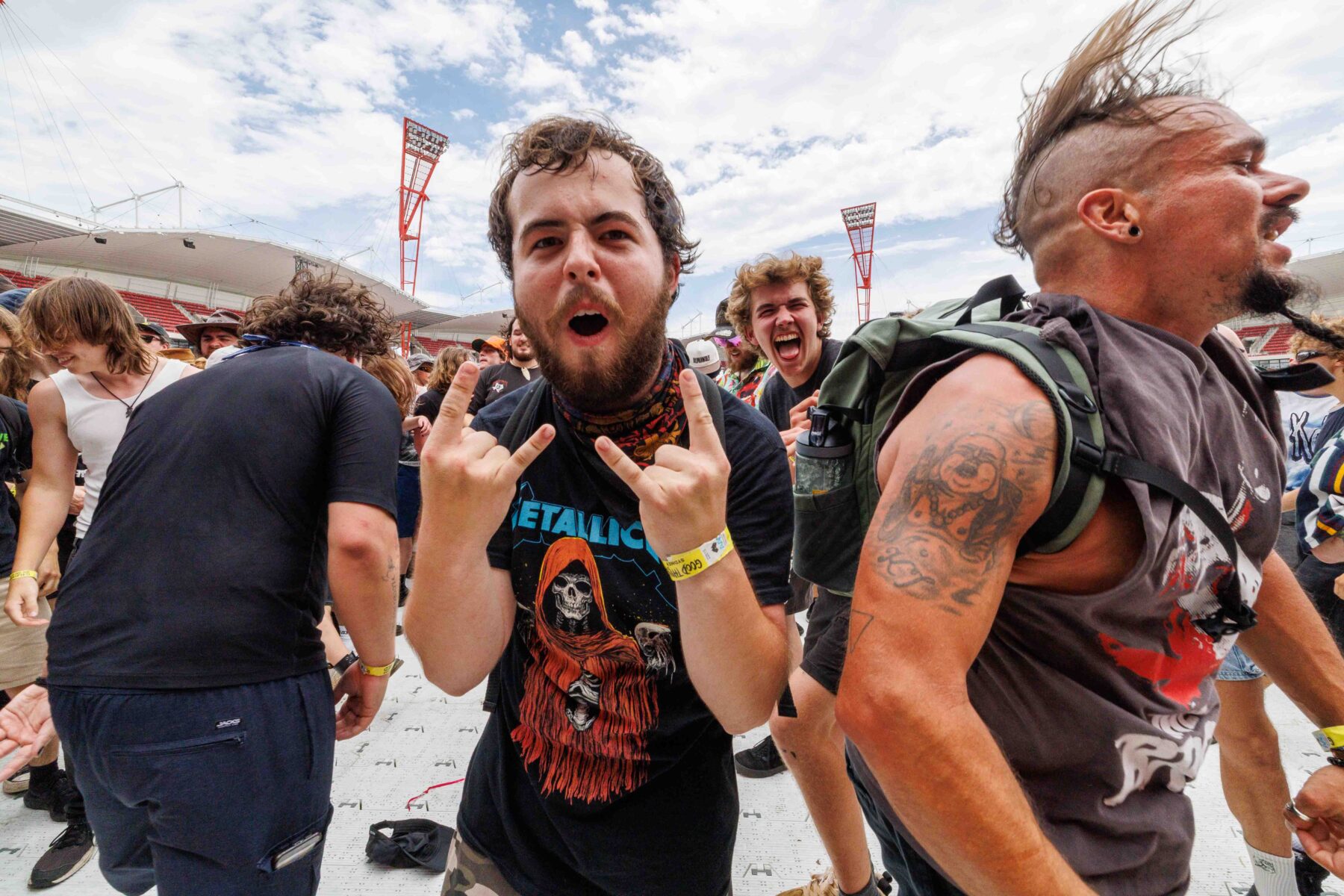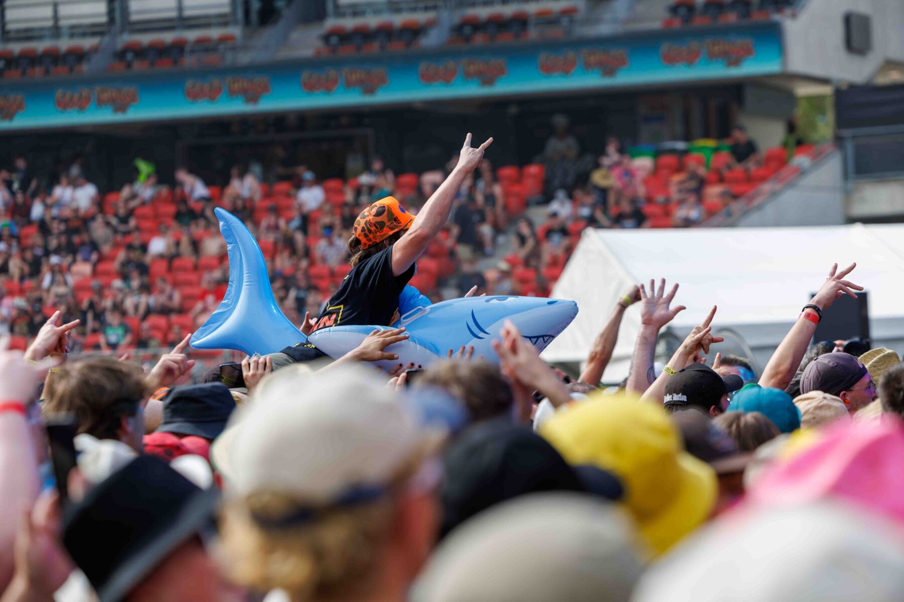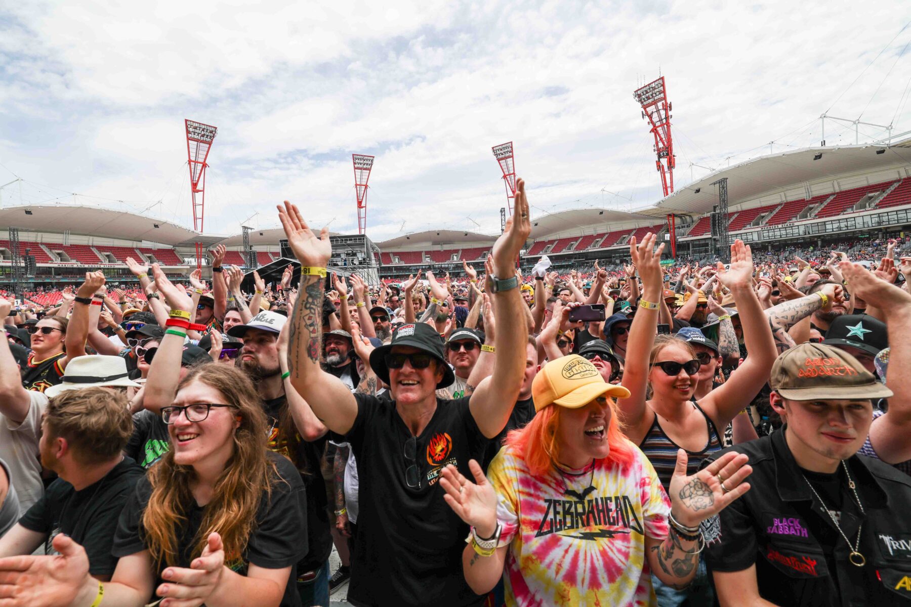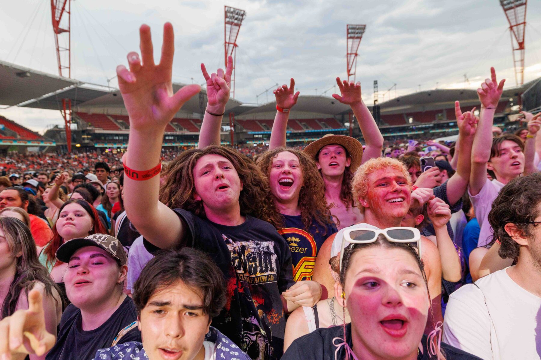 The day began under a merciless wave of heat, pushing everyone’s sunscreen to its absolute limit. Early sets became something of a badge of honour for both fans and bands, but the festival didn’t buckle. Hydration stations, shade pockets, and the occasional mist spray kept the masses alive long enough for the weather to finally turn in their favour. By late afternoon, a cool change drifted in, relieving the crowd and igniting a second wind that carried straight through the night. As temperatures dropped and stage lights rose, the Showgrounds transformed into a vibrant, electric nightscape—exactly the setting you want for a festival hitting its stride.