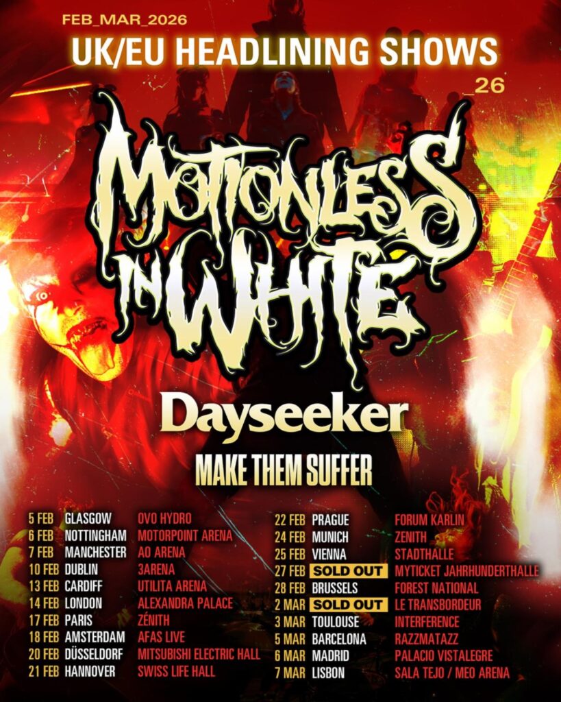 MOTIONLESS IN WHITE shortly return to raise hell across the UK and the continent with a monumental headline tour in February/March 2026. After the overwhelming response to their sold-out last run, the band is bringing even bigger production, new songs, and their boundless energy to arenas across the UK, Ireland, and mainland Europe. Support comes from Dayseeker and Make Them Suffer.