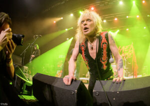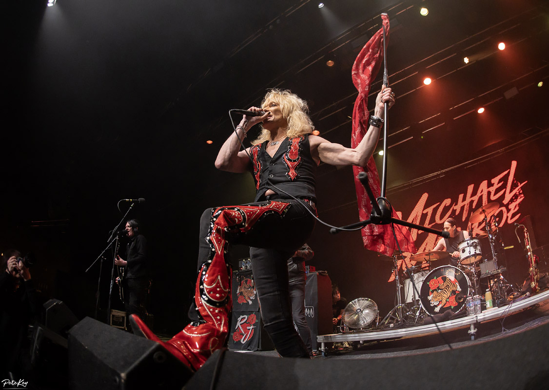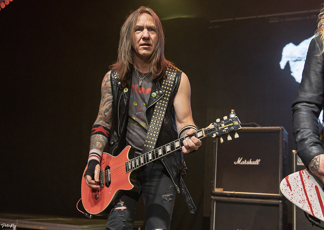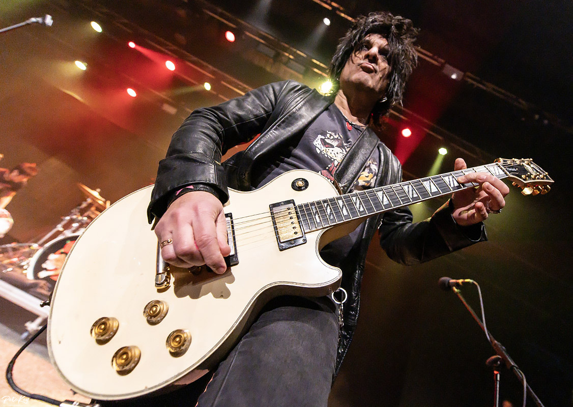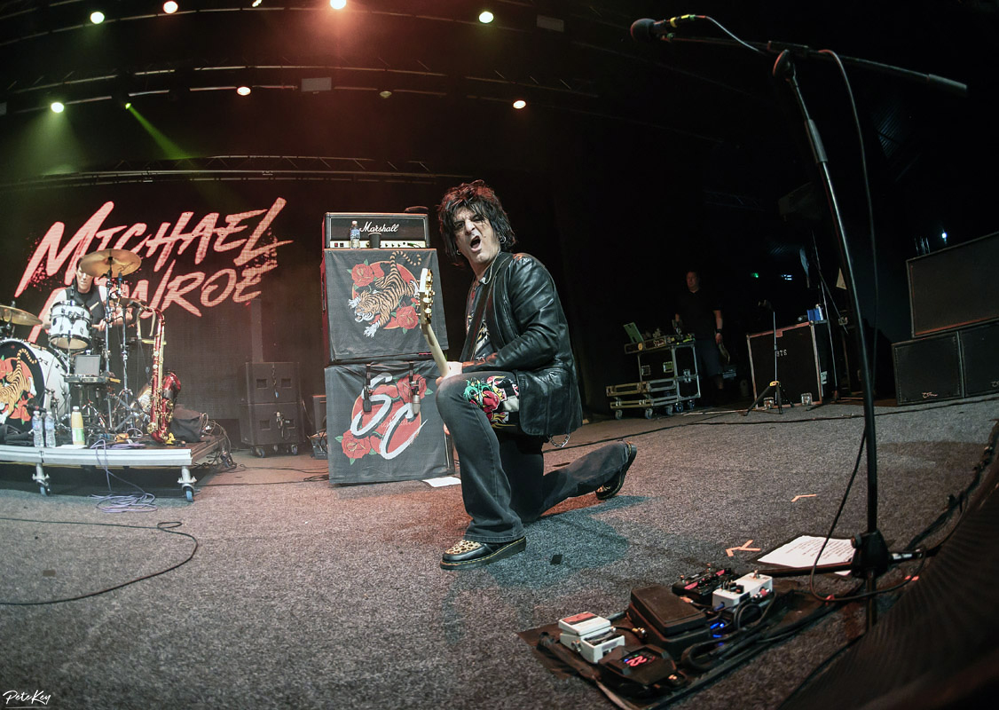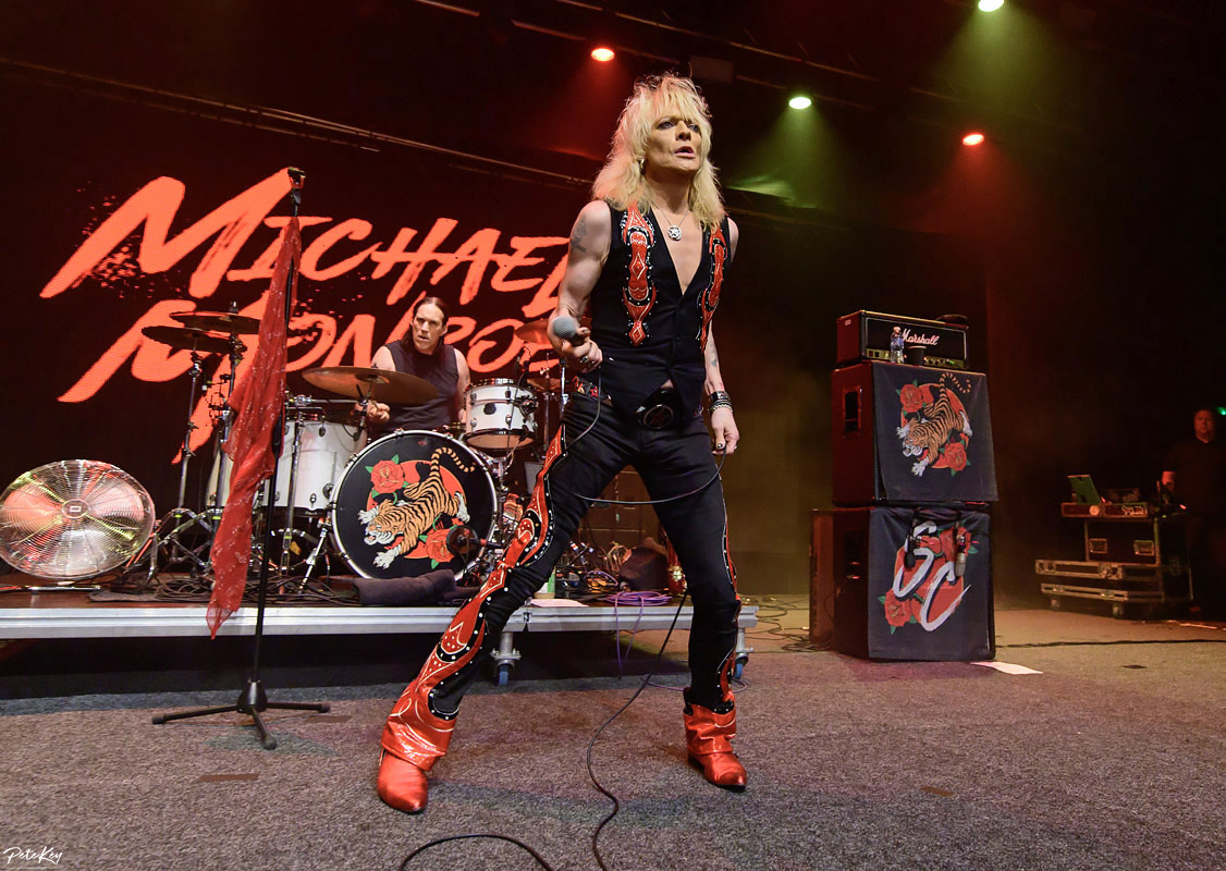 Cue a break for samosas, burgers and a beer. KK’s is by no means full but there’s a decent atmosphere building for when Monroe and his band appear. Of the 14 tracks on offer here, 5 were from his previous band Hanoi Rocks, a Finnish hair metal band with both the accolade of being the first in the UK and USA from there to chart, and something of a history for reforming! Listed as a major influence on bands such as Poison, Skid Row, (and some other group with flowers and firearms incorporated into their name), it wasn’t hard to anticipate their sound, although as noted on my album review there were very definite leanings at times into more modern (not that 90s is now modern I suppose) sounds, and this was apparent in the newer material, albeit not as prevalent as on the studio recordings.